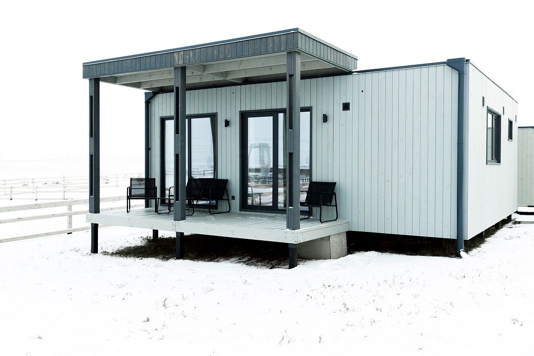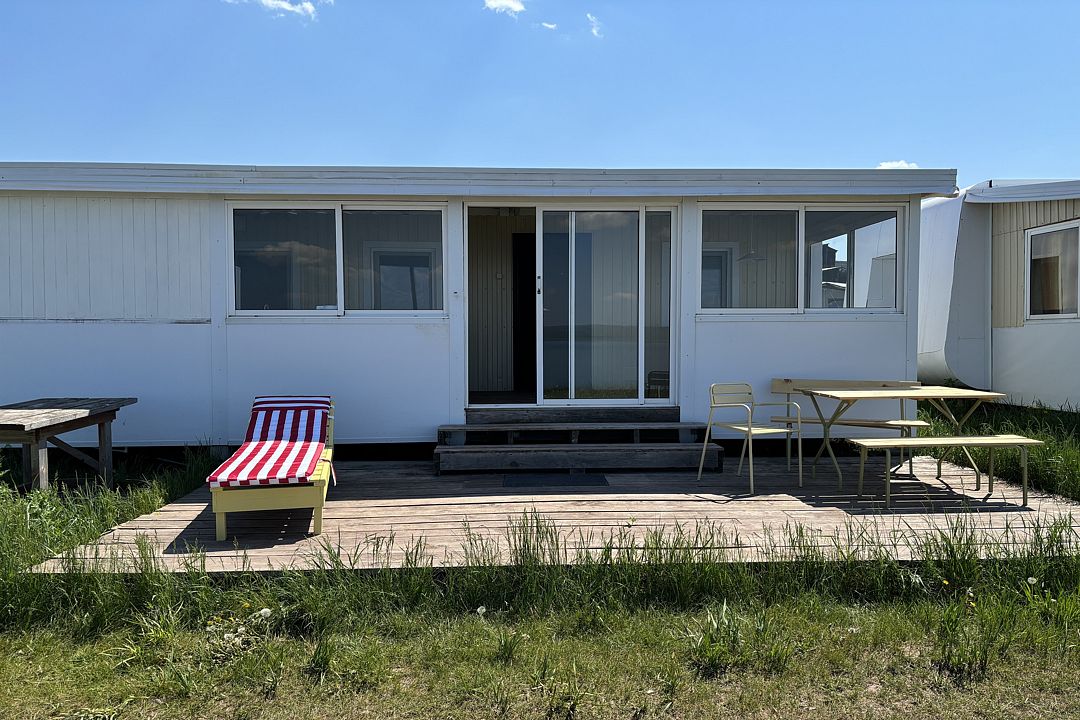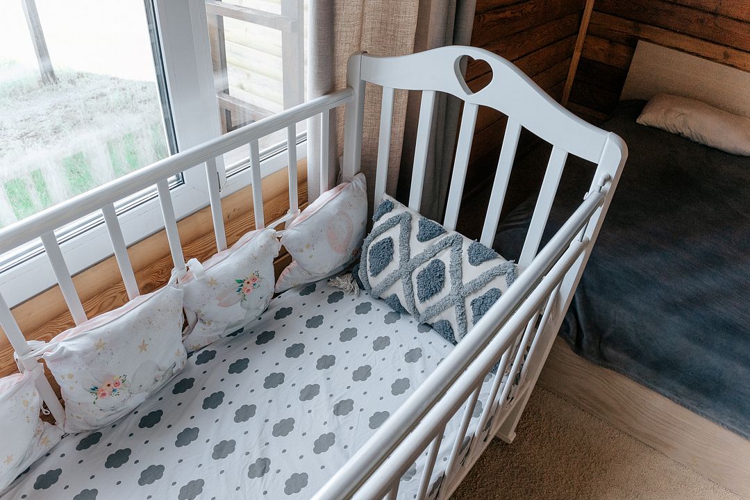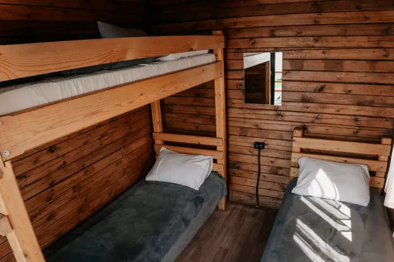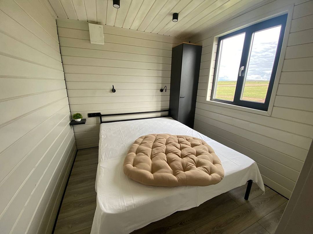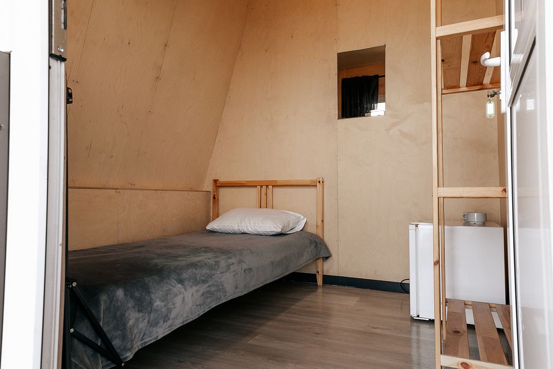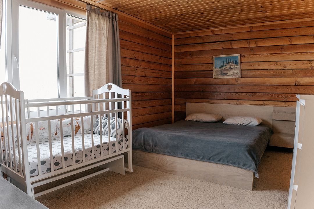 Домик идеально подходит для семейного отдыха с детьми. В комнате расположены большая двуспальная и одна двухъярусная кровати. Есть полки, зеркало, холодильник, комод и постельные принадлежности.
