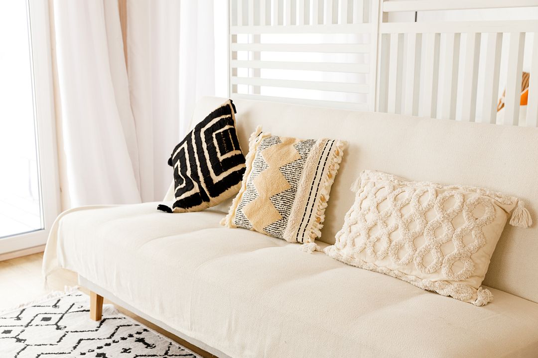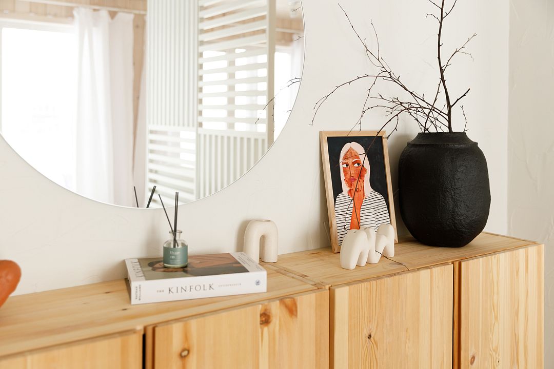 В большой комнате-гостиной расположен диван, в нише — большая двуспальная кровать. Рядом — тумбочки и вместительный комод для вещей.