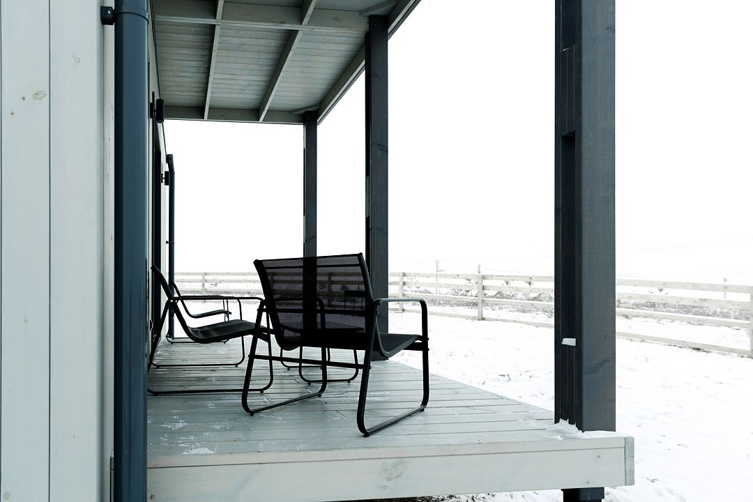 На каждом этаже имеется открытая терраса, оборудованная комплектом мебели — стол, стулья.