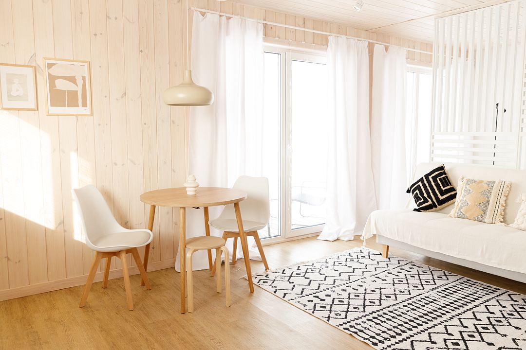 В большой комнате-гостиной расположен диван и обеденный стол со стульями, в спальне - большая двуспальная кровать. Рядом - полочки и вместительный шкаф для вещей.