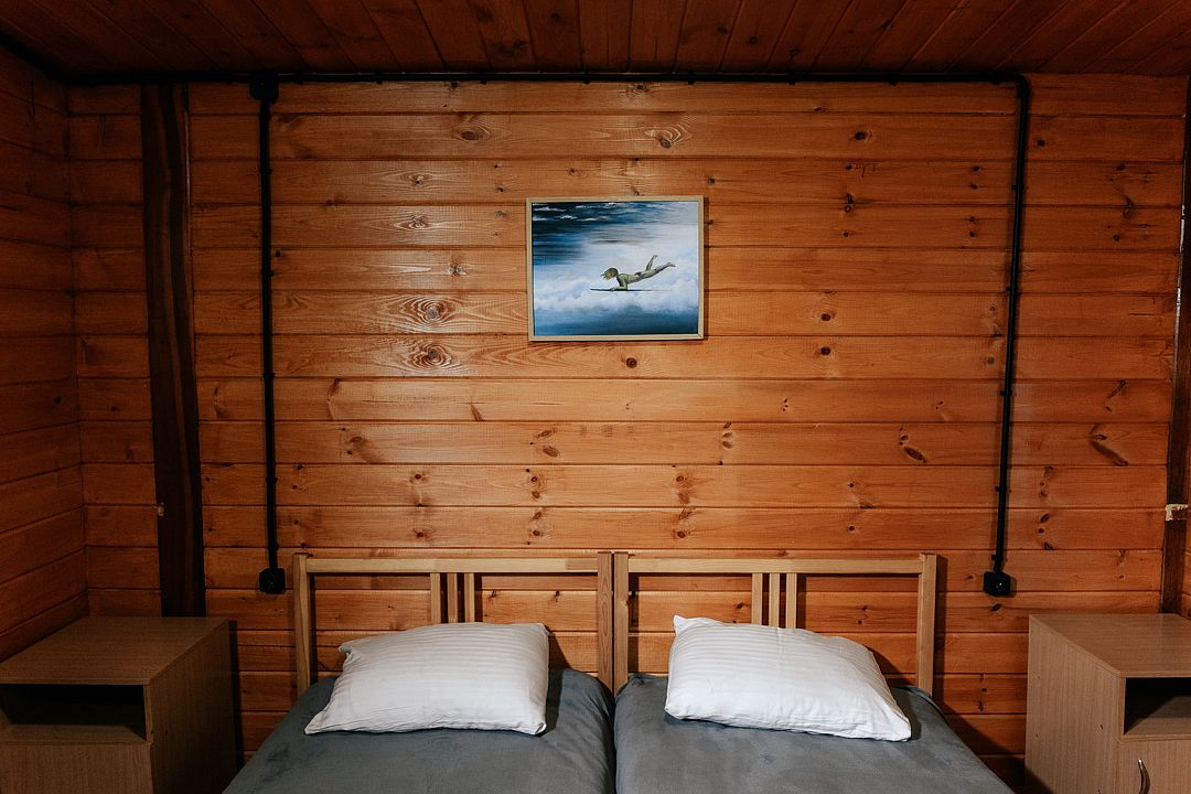 Гостевой коттедж разделен на два этажа и бронируется этажами. На каждом этаже расположены две 2-х местных комнаты, кухня и санузел. В каждой комнате две односпальные кровати, тумбочка, полки, зеркало, постельные принадлежности. Кухня оборудована холодильником, чайником, столом и лавками.