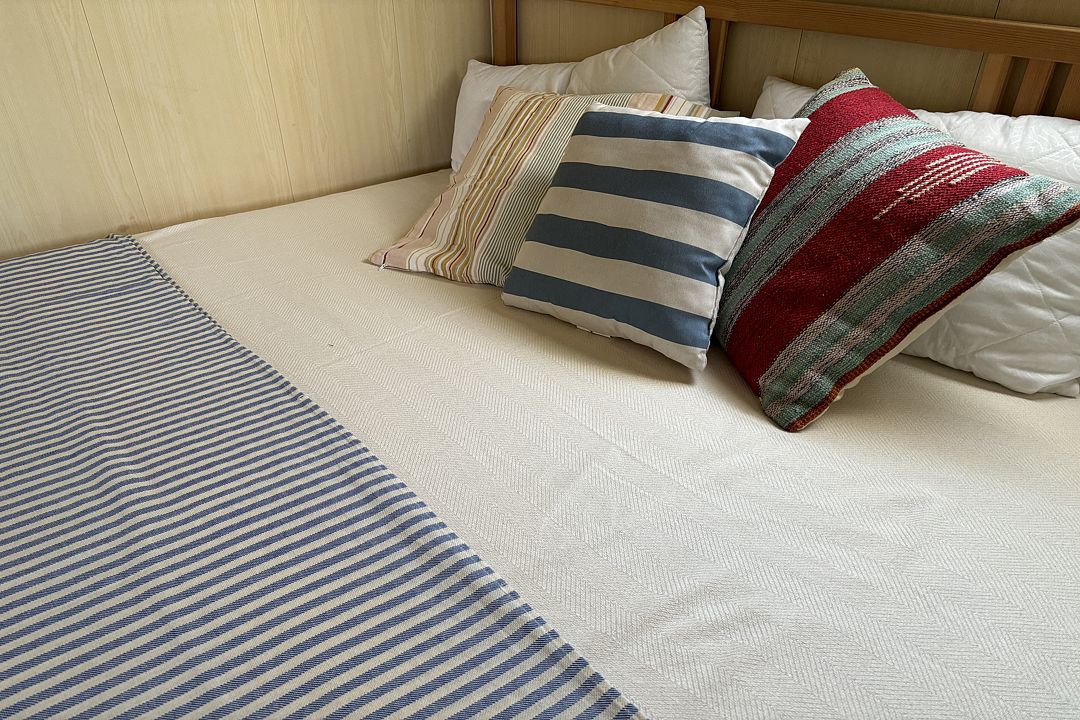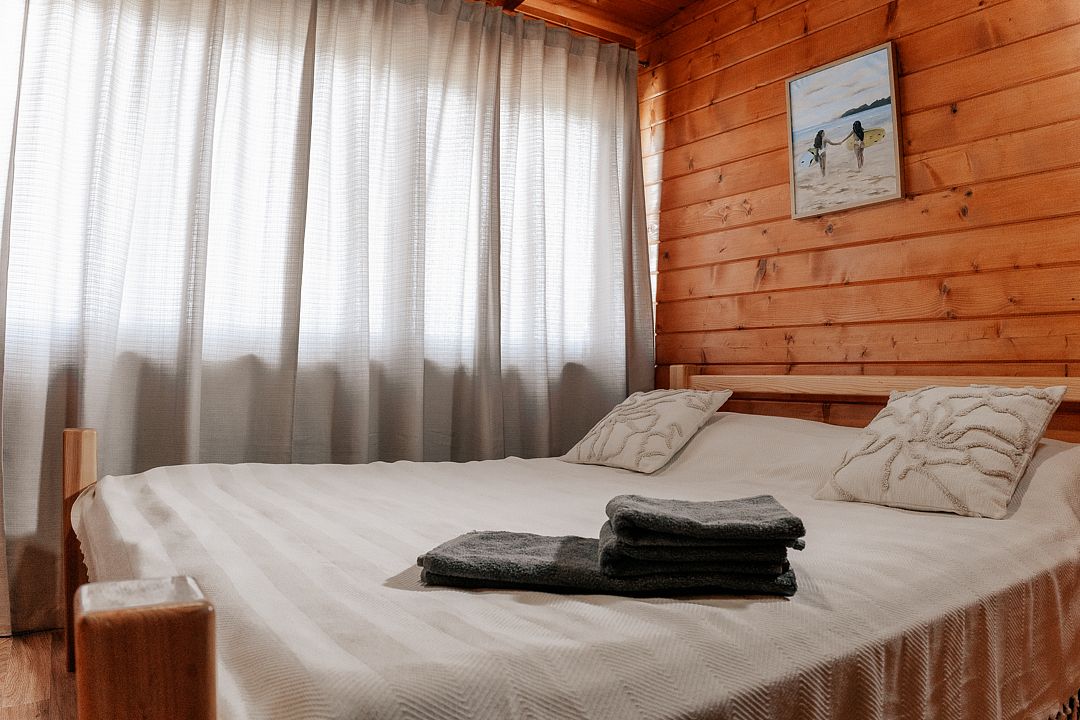 Домик с обновленным дизайном и ремонтом идеально подойдет для семейного отдыха. В комнате расположены большая двуспальная и одна двухъярусная кровати. Есть кондиционер, полки, зеркало, комод и постельные принадлежности.