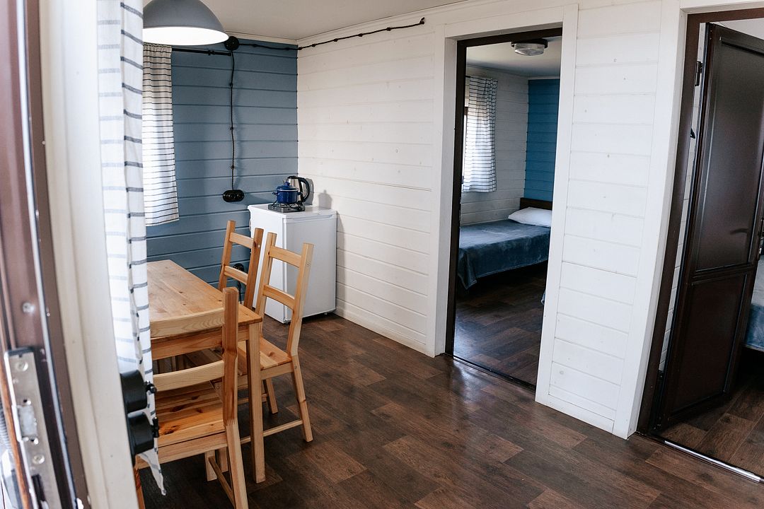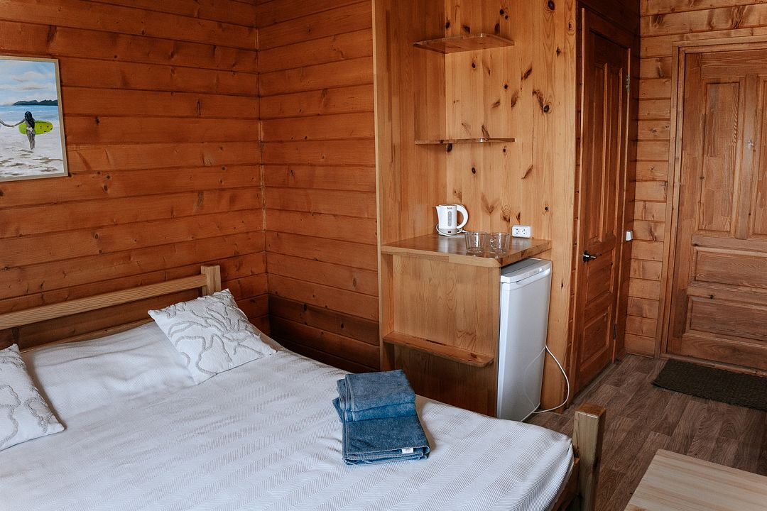 2-х местный номер Комфорт состоит из двух одноместных комнат с отдельным входом в каждую с террасы. Терраса с видом на озеро оборудована столиком и стульями. В комнате односпальная кровать, полки, зеркало, постельные принадлежности. Есть чайник и мини-холодильник.