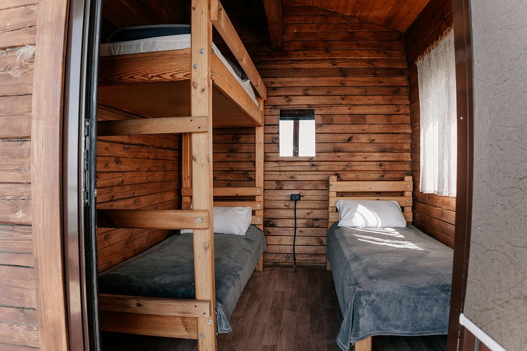 3-х местный номер находится в 6-ти местном домике. Домики расположены на второй береговой линии. В комнате три спальных места — на односпальной и двухъярусной кроватях.
