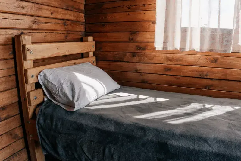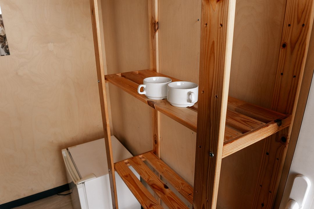 2-х местный номер Комфорт оснащен деревянной мебелью — двуспальная кровать, полки, комод. В каждом номере имеется холодильник, чайник и постельные принадлежности.