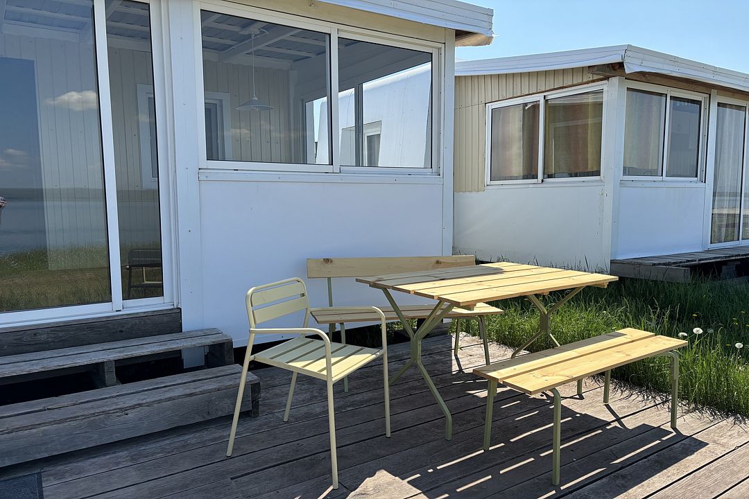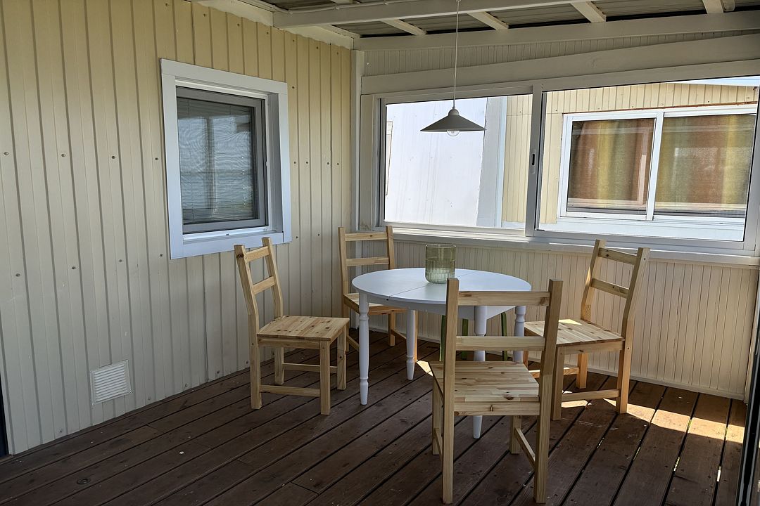 Терраса оборудована комплектом мебели — столом и стульями. Здесь есть умывальник с емкостью для воды.