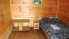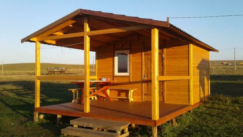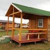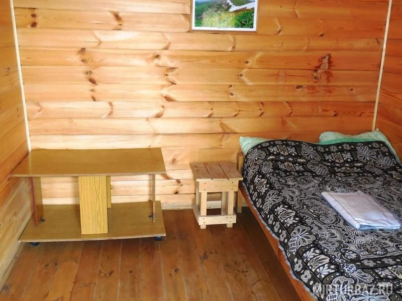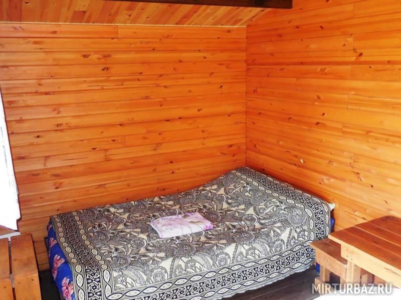 В деревянном домике имеется двуспальная кровать, двухъярусная кровать, столик, табуреты, настенная вешалка для одежды. На открытой веранде стоит стол с двумя лавочками. Парковка автомобиля рядом с домиком.