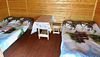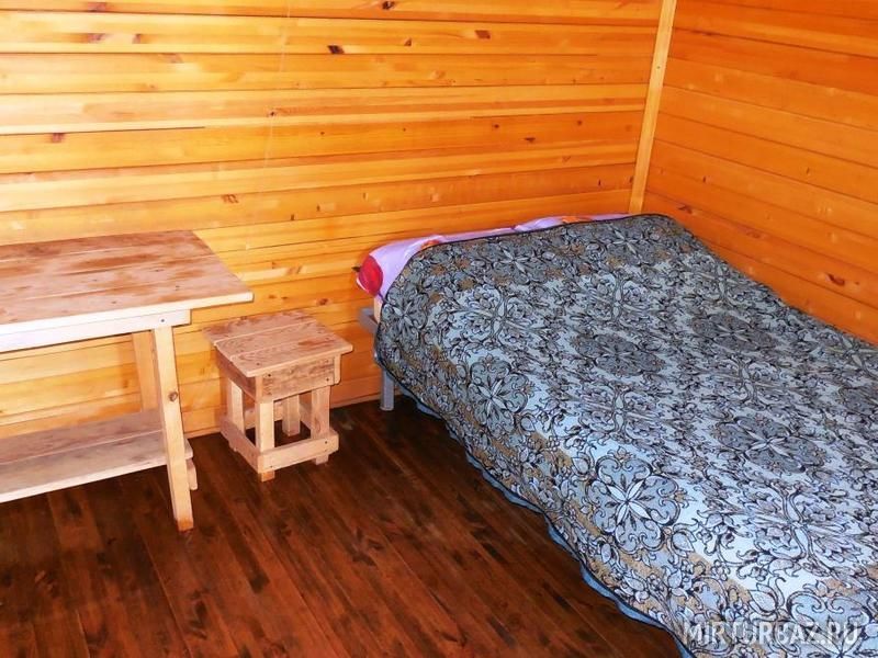 В каждой жилой комнате имеется двуспальная кровать, столик, табуреты, настенная вешалка для одежды. Веранда разделена деревянной стойкой на две части. На каждой половине веранды стоит стол с двумя лавочками. Парковка автомобиля рядом с домиком.