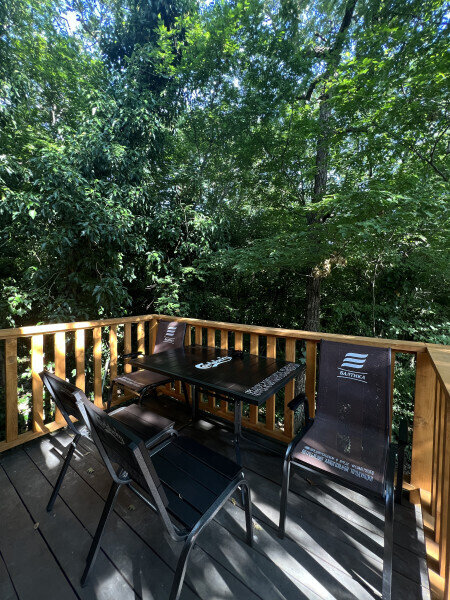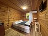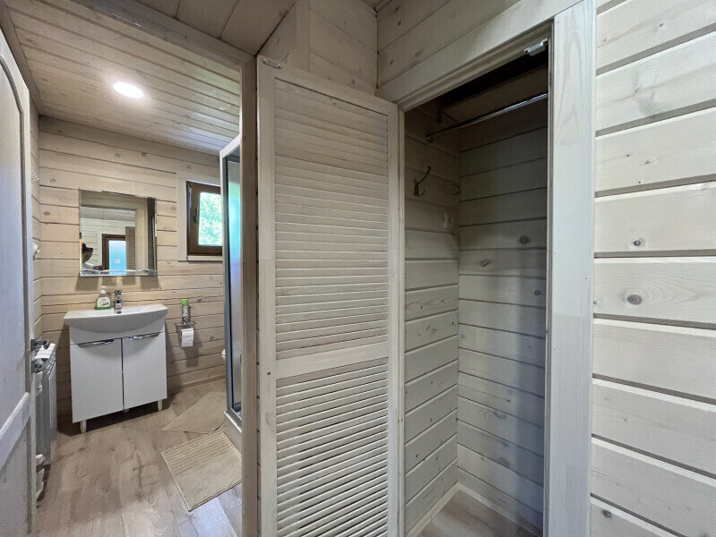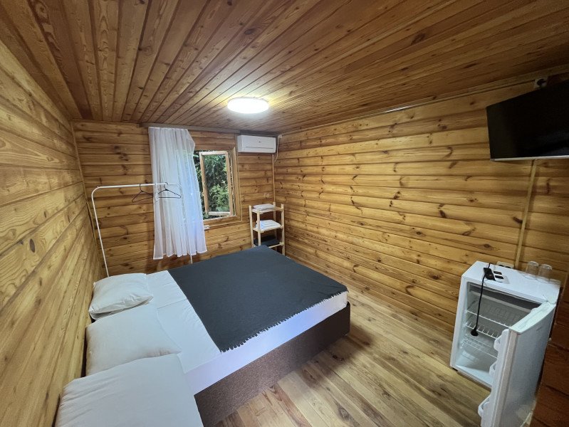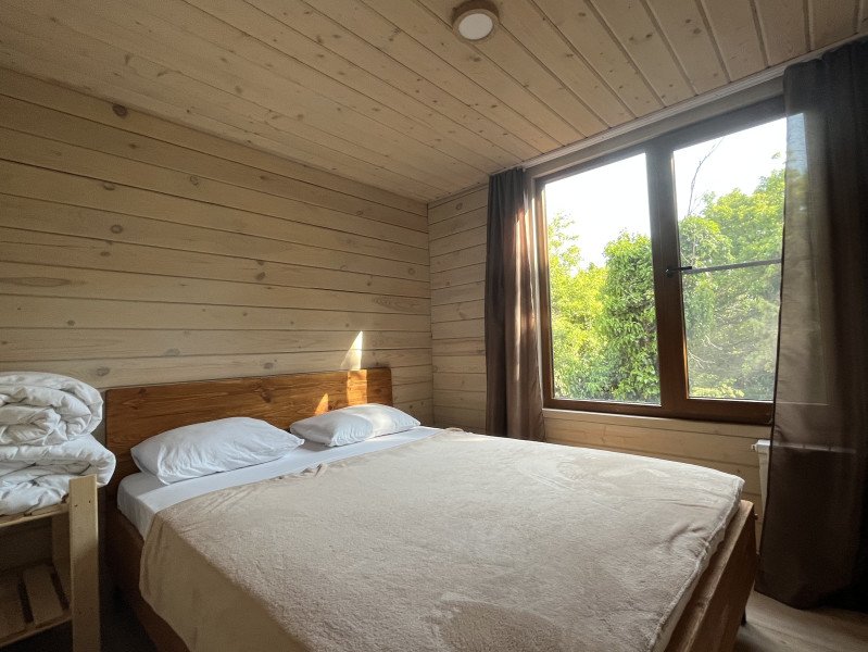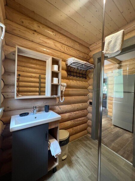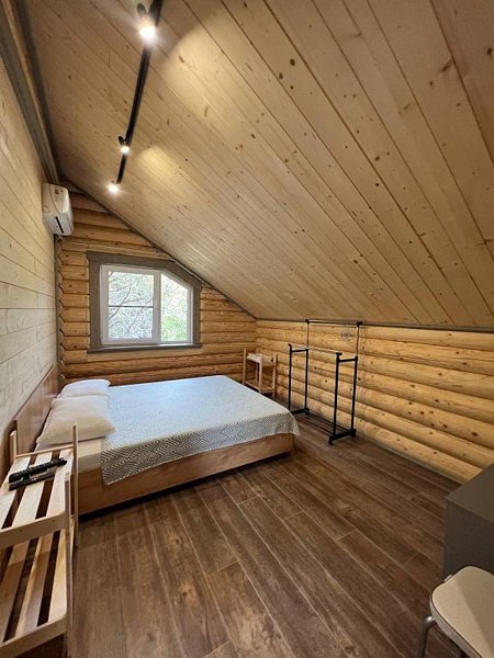 Новый номер с кухней из сруба на 4 человека (2 этаж). На этаже — 2 спальни с двуспальной кроватью, мини-кухня, санузел с душем, выход на балкон, мангальная зона.