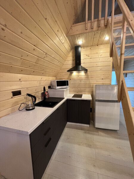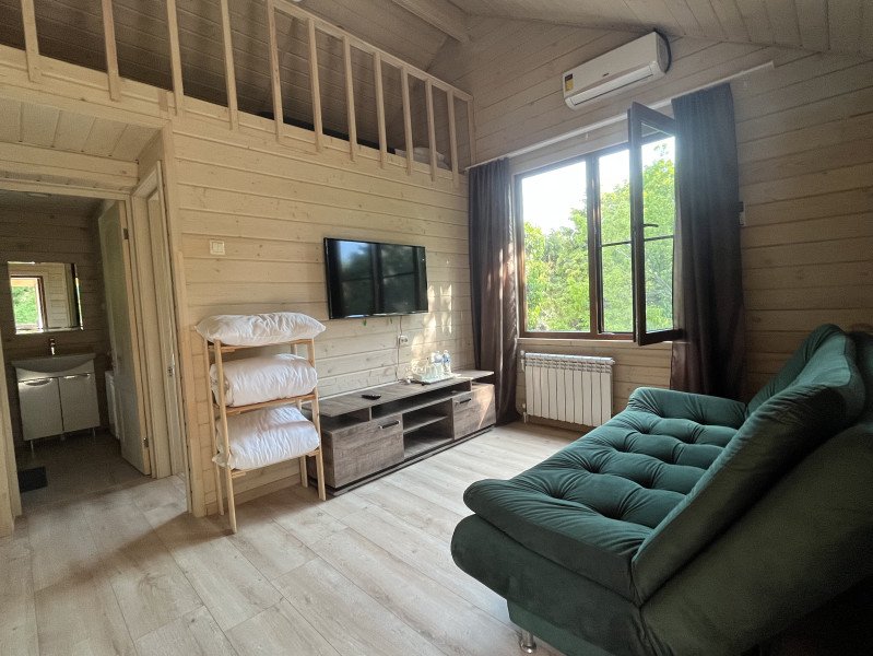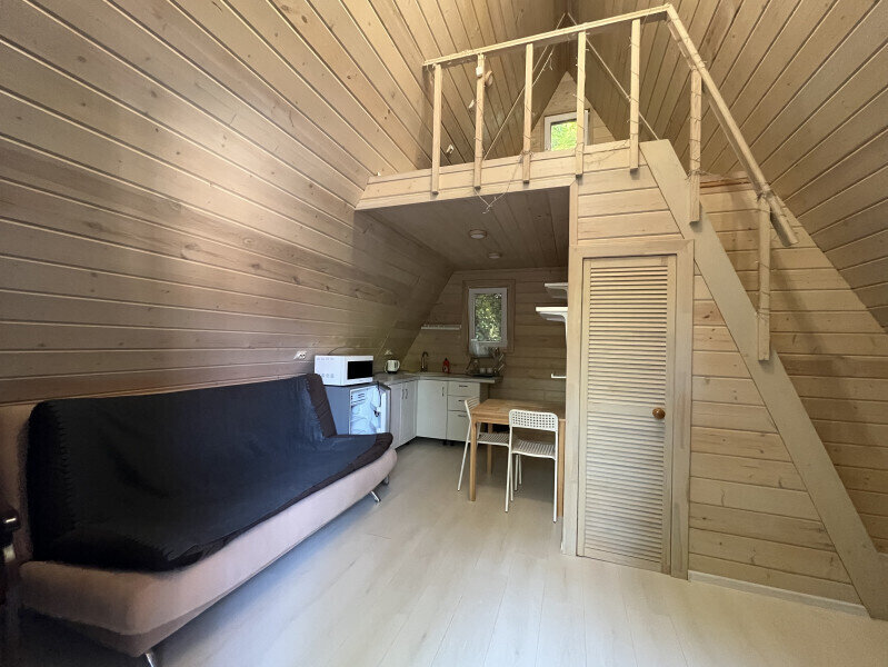 В номере кухня-гостиная + мансардный этаж, санузел.