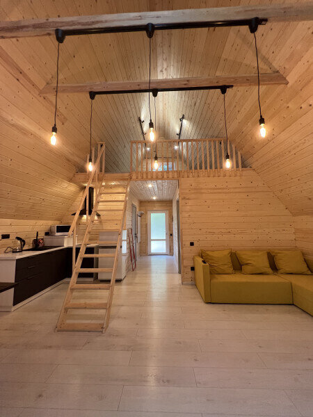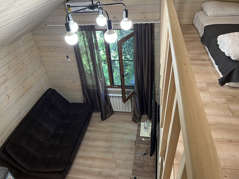 В номере: кухня-гостинная с мансардным этажом, спальня, санузел, маленькая терраса, мангальная зона.