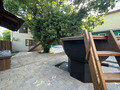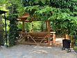 Выход на террасу со столиками и стульями, есть мангальная зона.