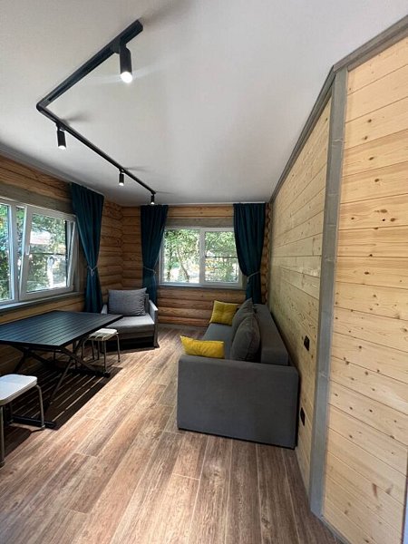 Новый номер с кухней из сруба на 4-5 человек (1 этаж). На этаже — спальня на двоих, гостиная с двуспальным диваном и креслом-кроватью, полностью укомплектованная кухня, санузел с душем, выход на мини-террасу, мангальная зона.
