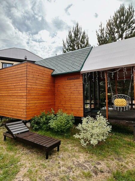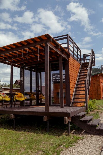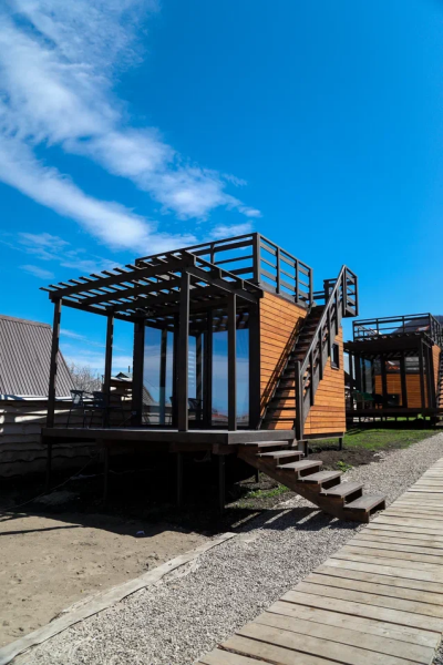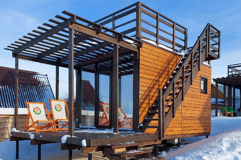 Площадь домика — 14 м², нижняя терраса — 6 м², верхняя терраса — 14 м². Размещение: два взрослых + один ребенок. Панорамные окна, панорамная терраса на крыше и перед домом. На территории оборудованы детские площадки с качелями.
