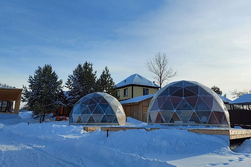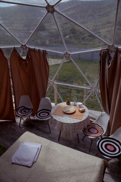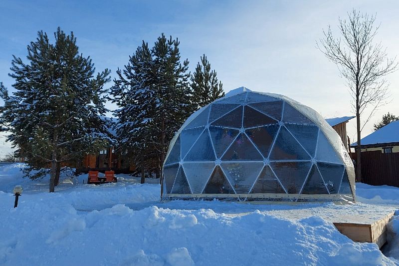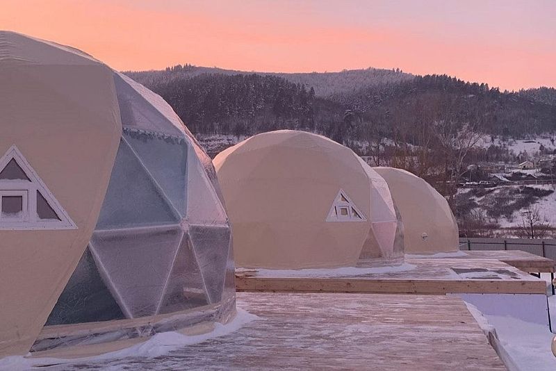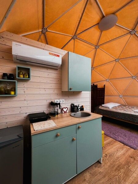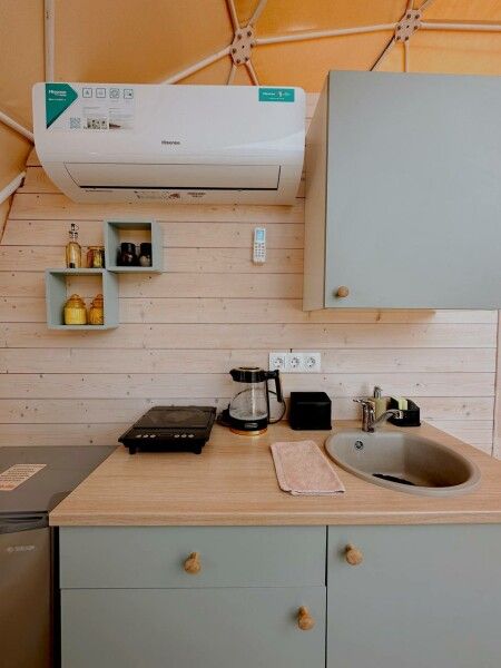 В куполе: кондиционер; мини-кухня: чайник, плита, небольшой холодильник, посуда, столик; двуспальная кровать; ортопедические матрасы, дизайнерские детали интерьера, создающие уют; раскладной двуспальный диван; постельное белье, полотенца; санузел и душ, водонагреватель; шампунь, кондиционер для волос и гель для душа; обогрев пола.