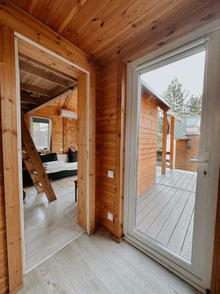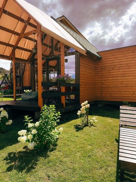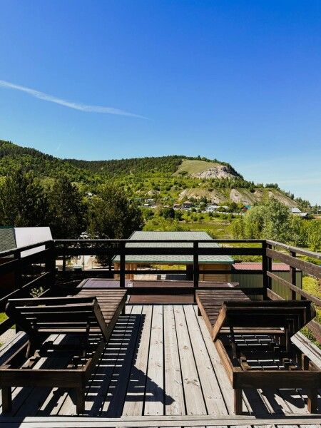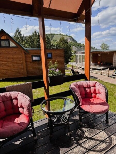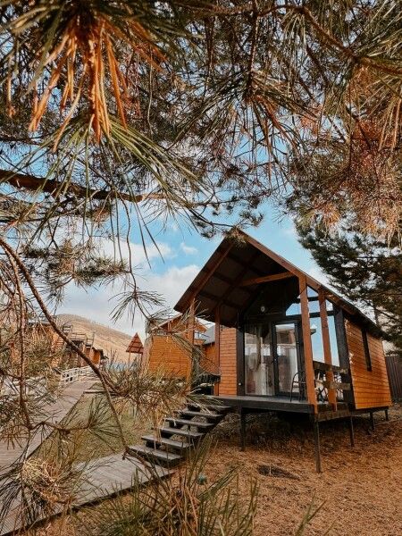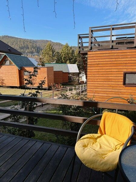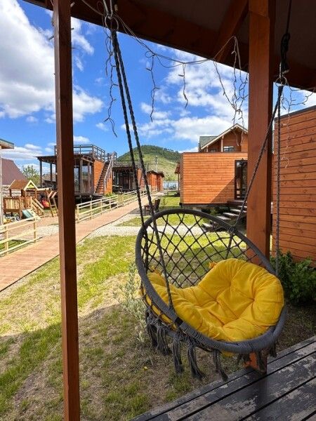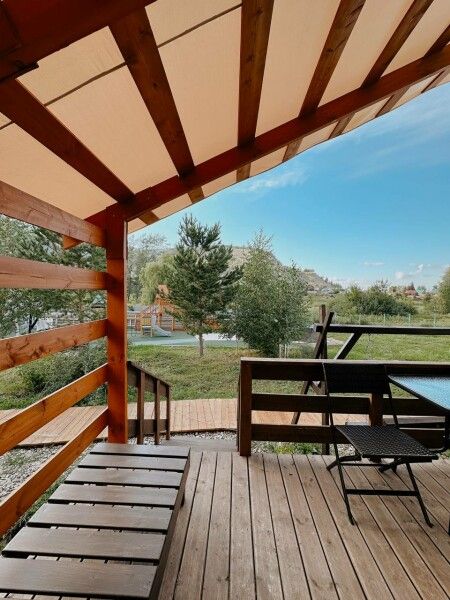 Площадь домика — 18 м², терраса — 6 м². Размещение: два взрослых + два ребенка, дополнительное место на диване. Вид на гору и сосны, панорамная терраса. На территории оборудованы детские площадки с качелями.