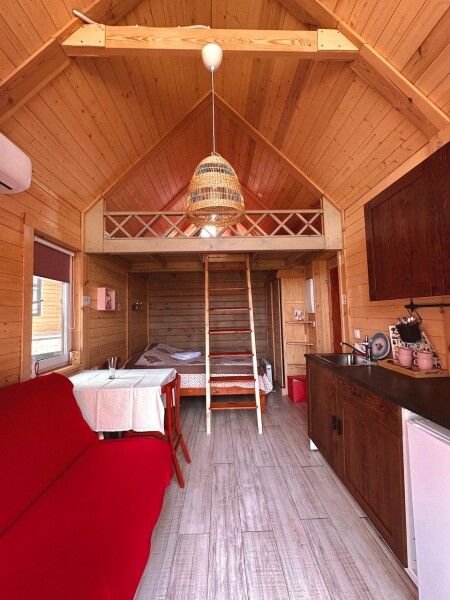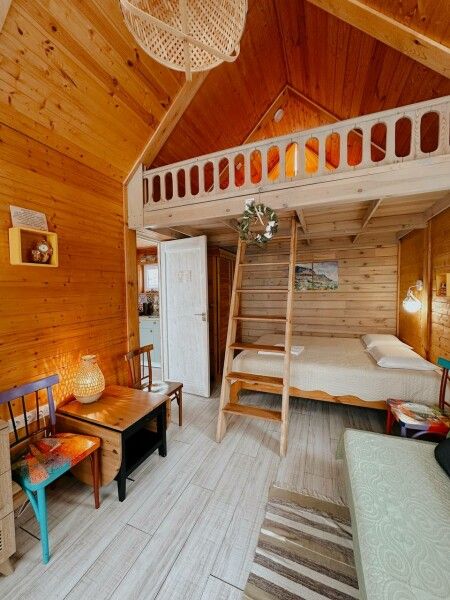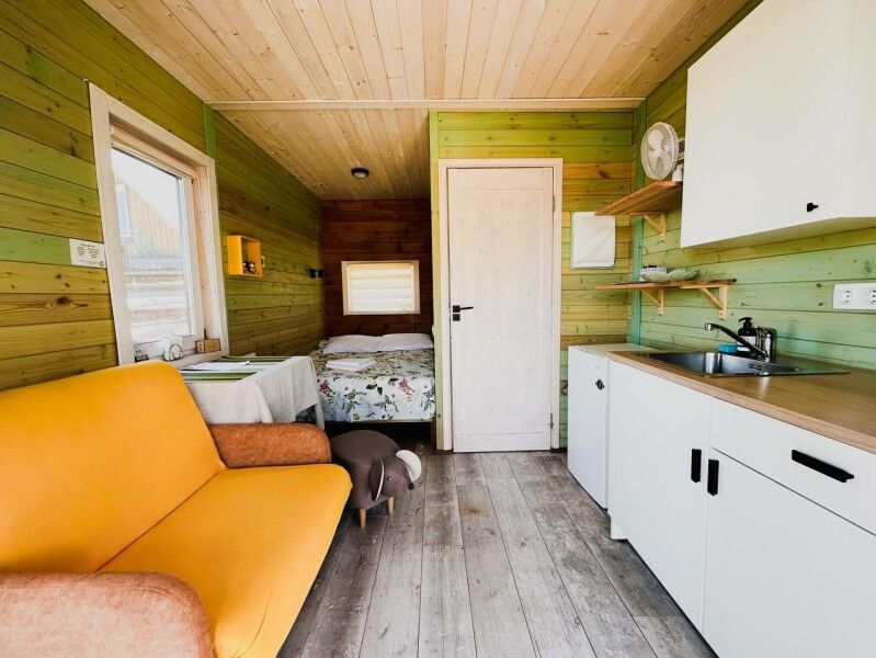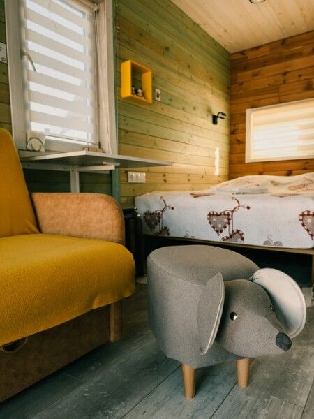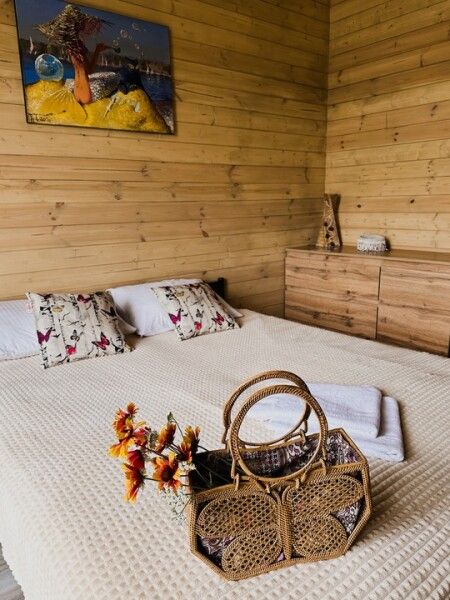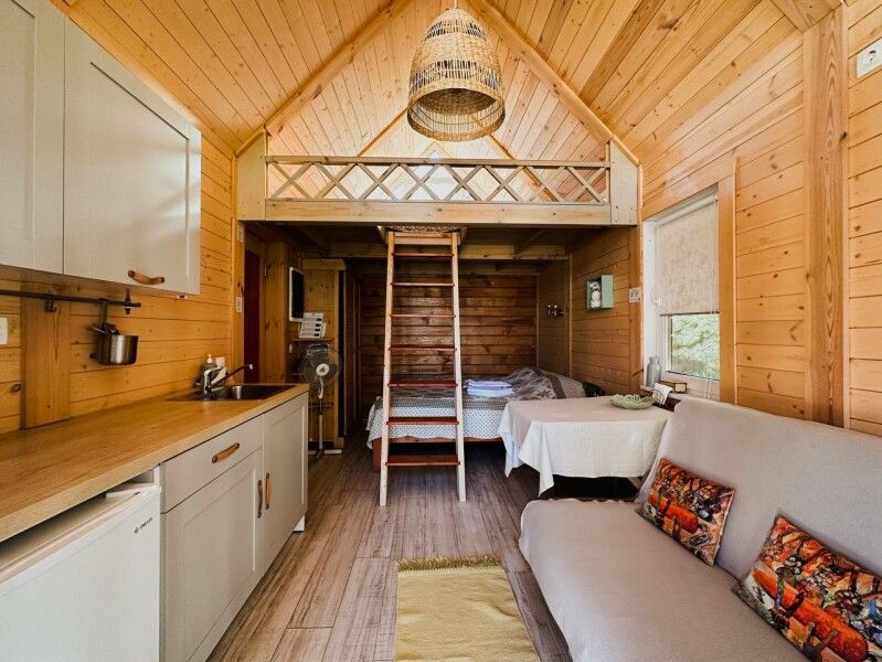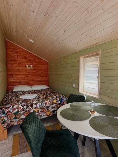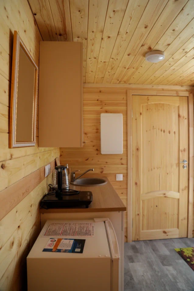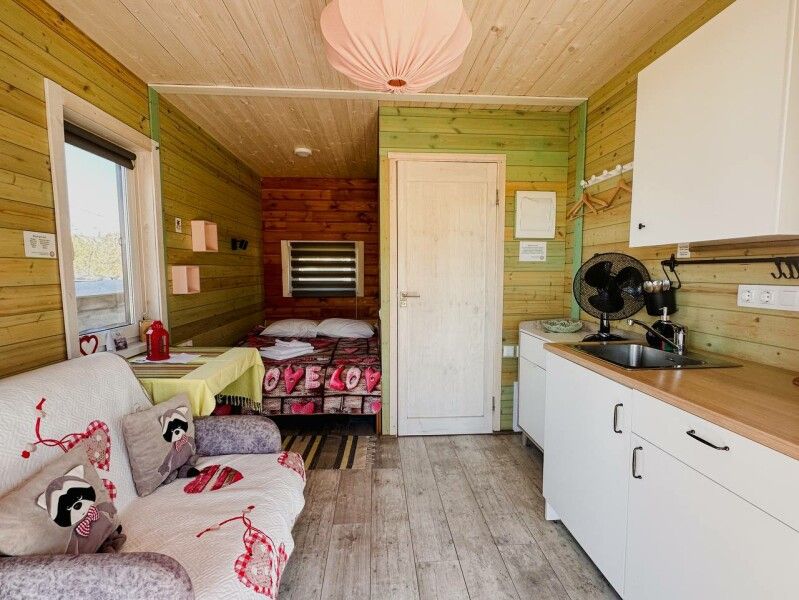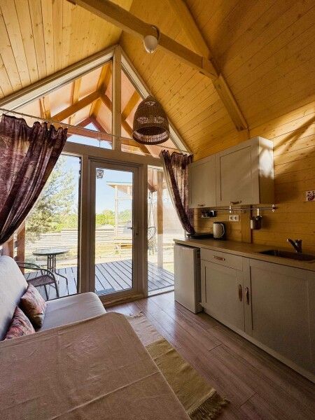 В домике: мини-кухня: чайник, плита, небольшой холодильник, посуда, откидной столик; двуспальная кровать; раскладное кресло-кровать; ортопедический матрас, дизайнерские детали интерьера, создающие уют.