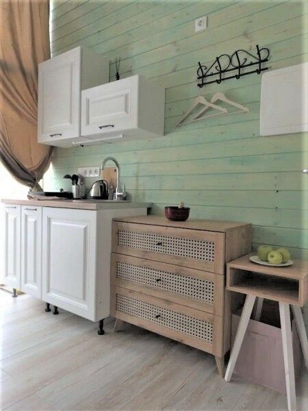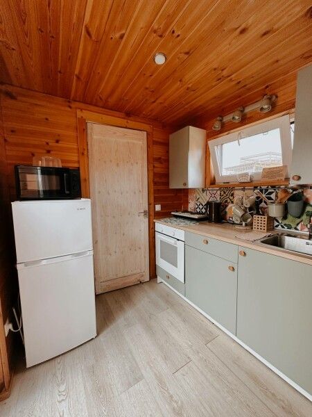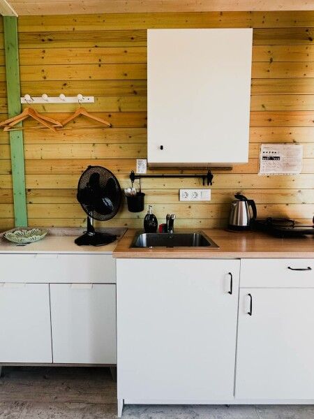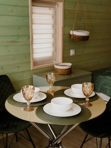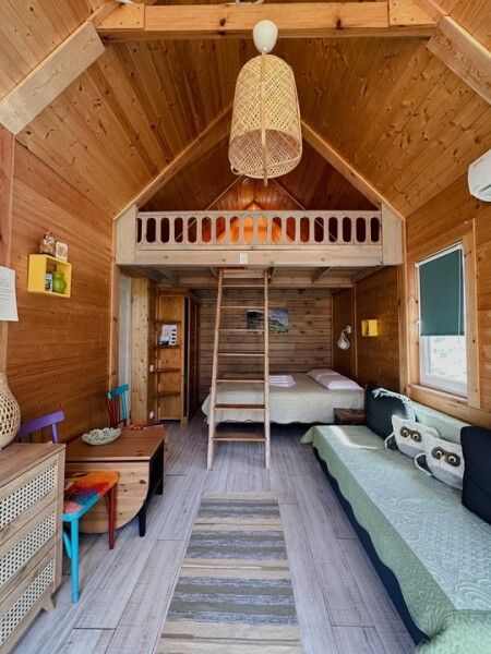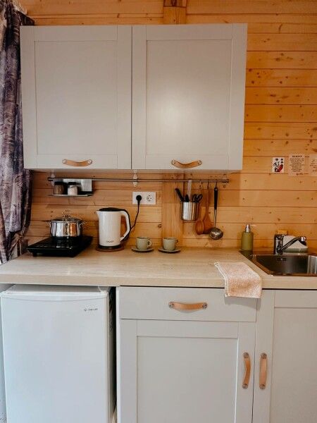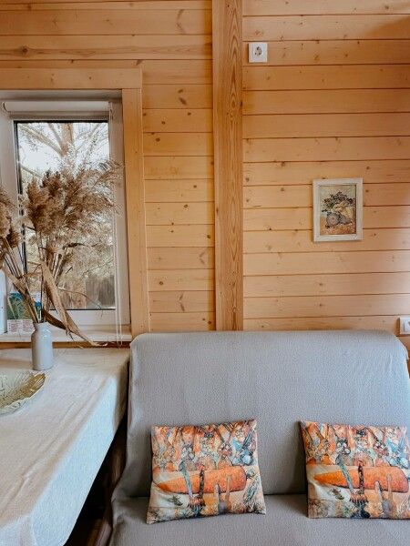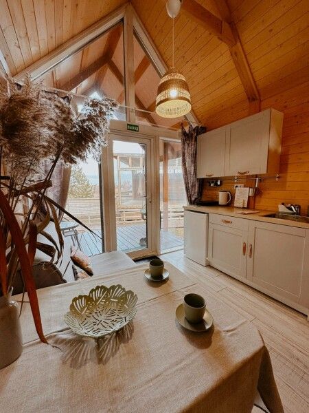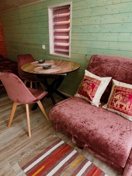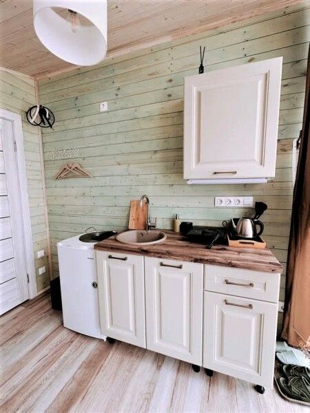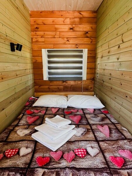 В домике: мини-кухня: чайник, плита, небольшой холодильник, посуда, откидной столик; двуспальная кровать; раскладное кресло-кровать; ортопедический матрас, дизайнерские детали интерьера, создающие уют.