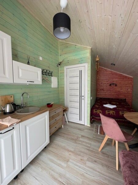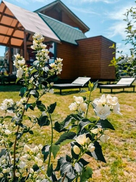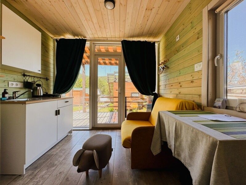 Домик с отдельным входом подходит для пары или небольшой семьи. Площадь домика — 14 м², терраса — 6 м². Размещение: два взрослых + один ребенок. На территории оборудованы детские площадки с качелями.
