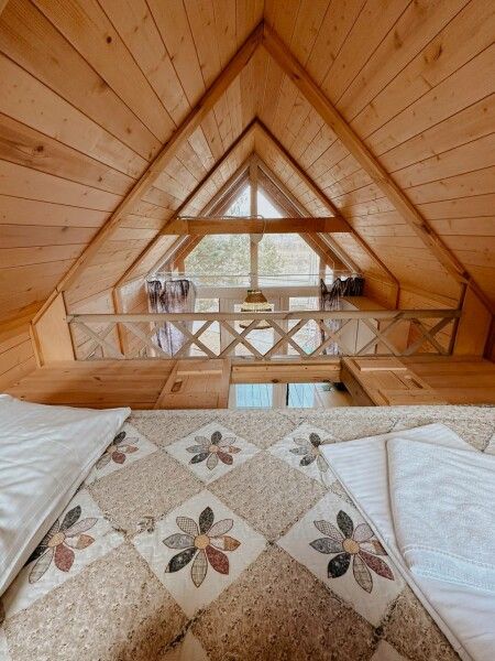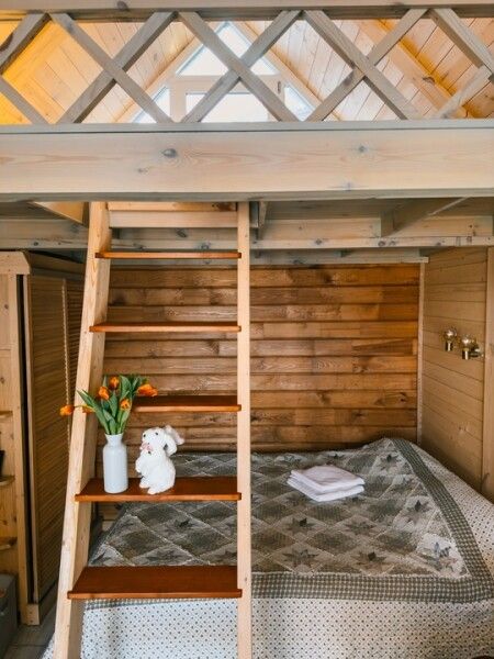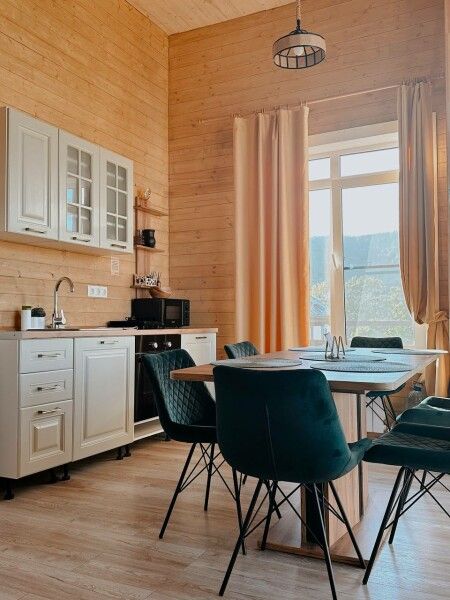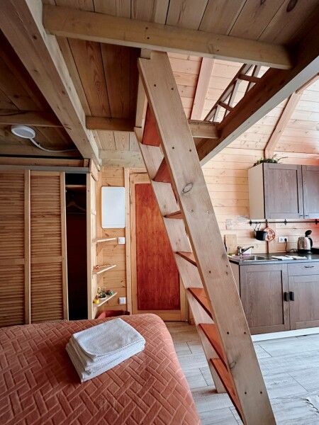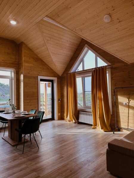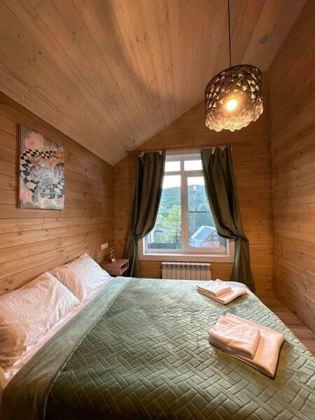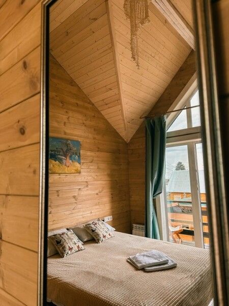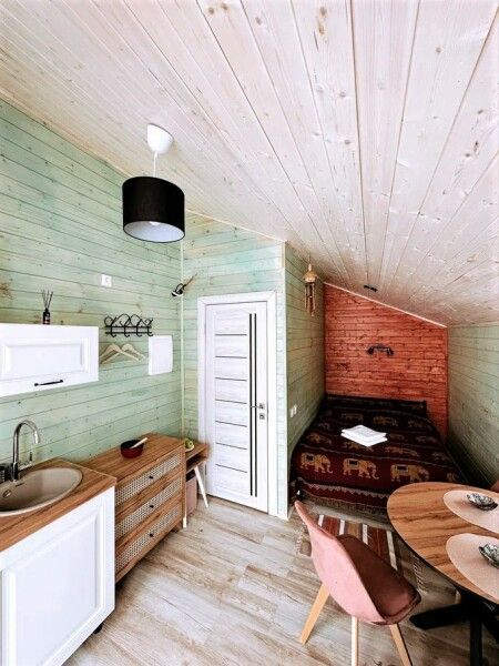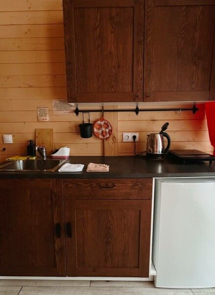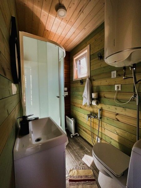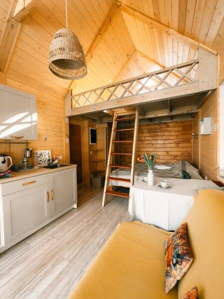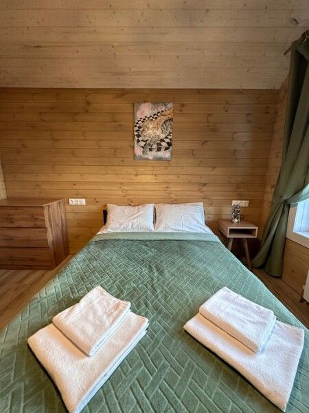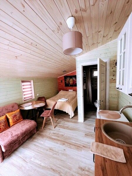 В домике: мини-кухня: чайник, плита, небольшой холодильник, посуда, откидной столик; двуспальная кровать; двуспальное место на мансардном этаже; ортопедические матрасы, дизайнерские детали интерьера, создающие уют; раскладной диван; постельное белье, полотенца; санузел и душ, водонагреватель; шампунь, кондиционер для волос и гель для душа; обогрев пола.