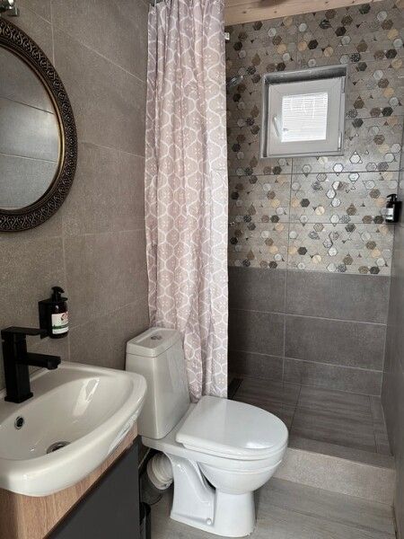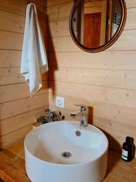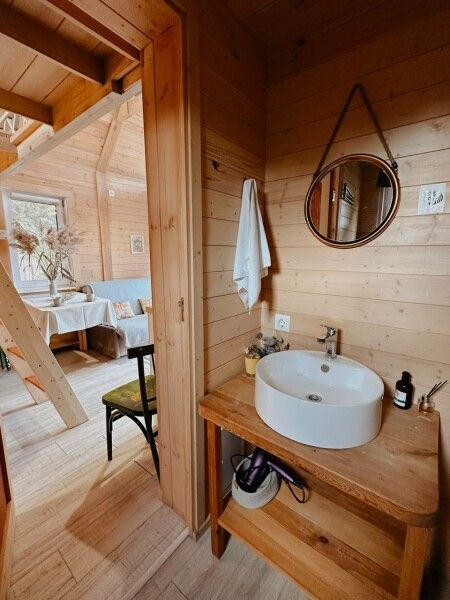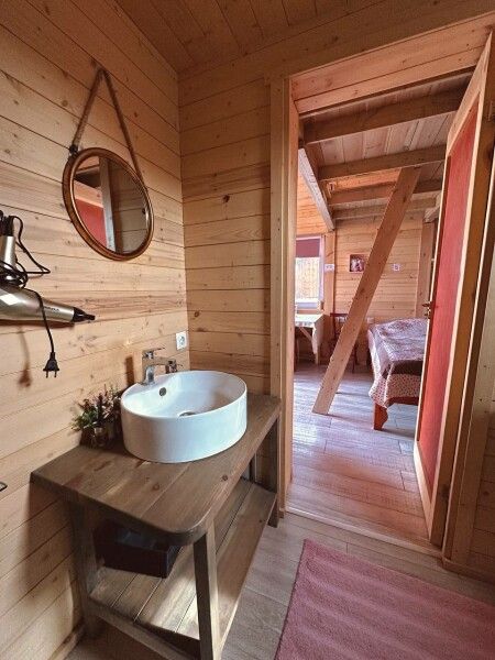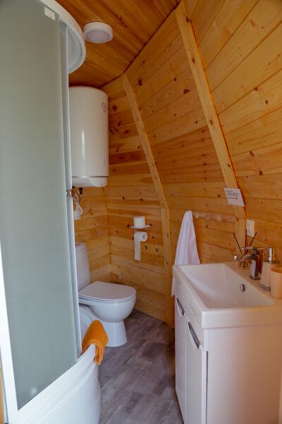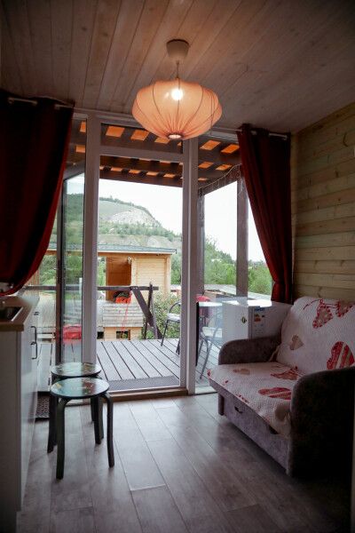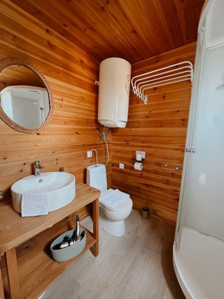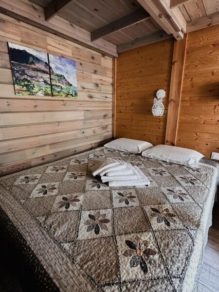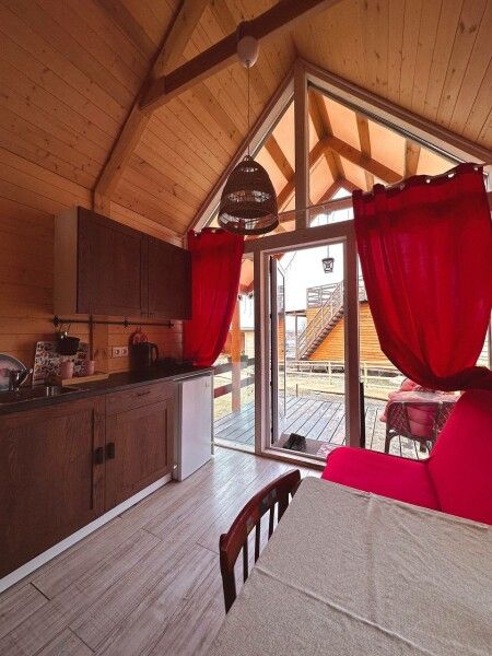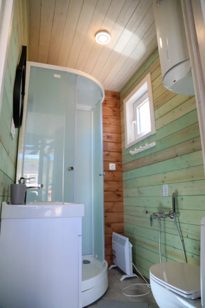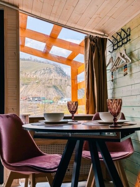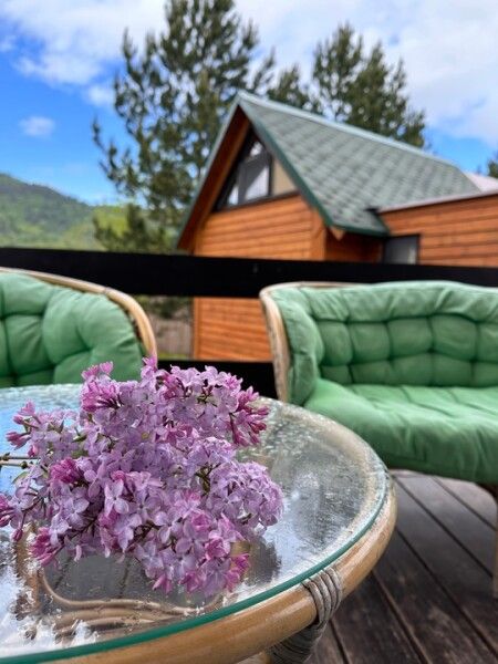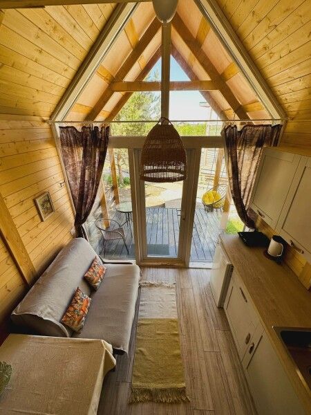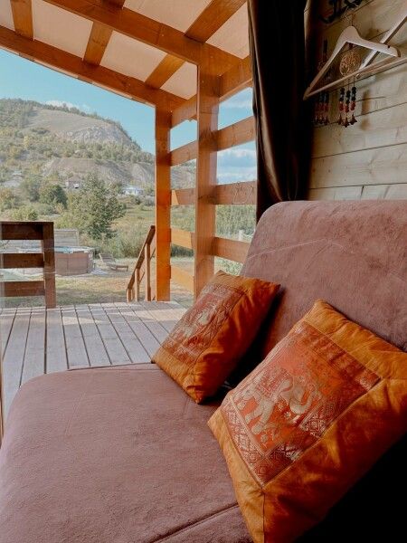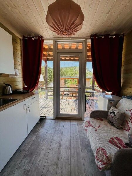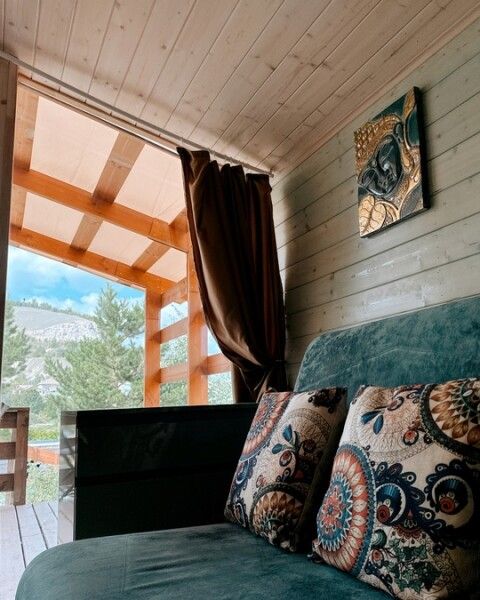 В домике: панорамные окна, вид на горы, панорамная терраса; одна двуспальная кровать; раскладное кресло-кровать; кондиционер; санузел и душ, водонагреватель; шампунь, кондиционер для волос и гель для душа.