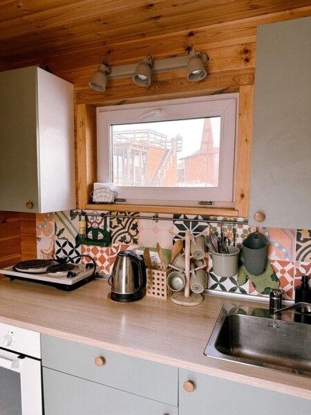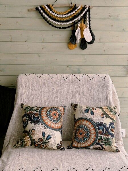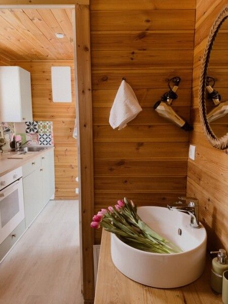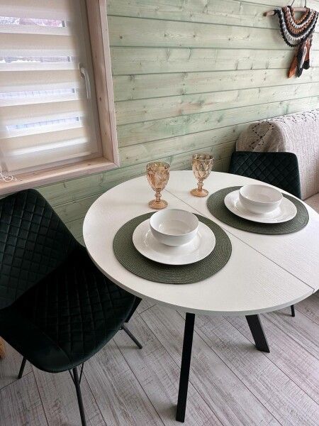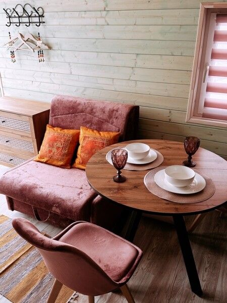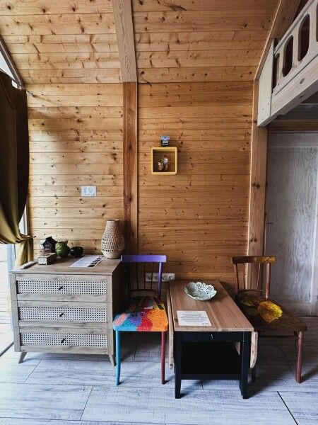 В доме компактный раскладной стол, комфортный матрас, дизайнерские детали интерьера создают уют; обогрев пола.