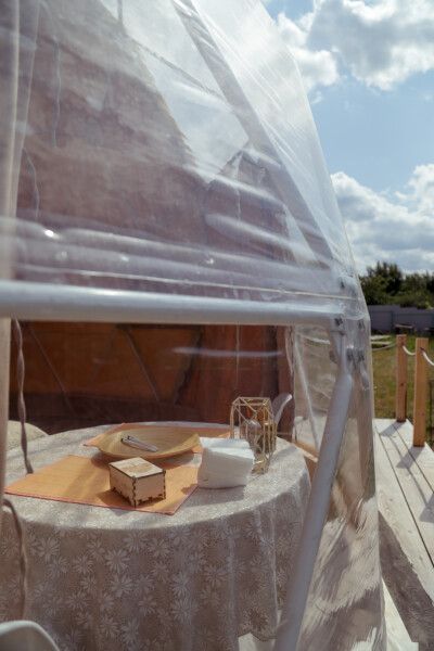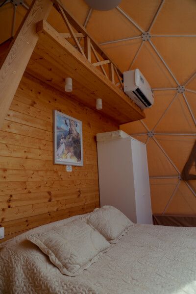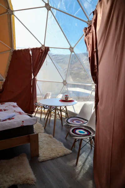 В куполе: кондиционер; мини-кухня: чайник, плита, небольшой холодильник, посуда, столик; двуспальная кровать (имеется возможность разделения ее на две односпальные); ортопедические матрасы, дизайнерские детали интерьера, создающие уют; раскладной двуспальный диван; постельное белье, полотенца; санузел и душ, водонагреватель; шампунь, кондиционер для волос и гель для душа; обогрев пола.
