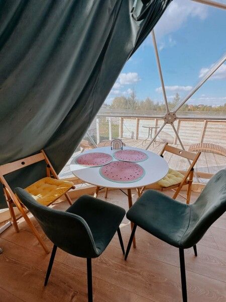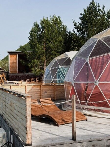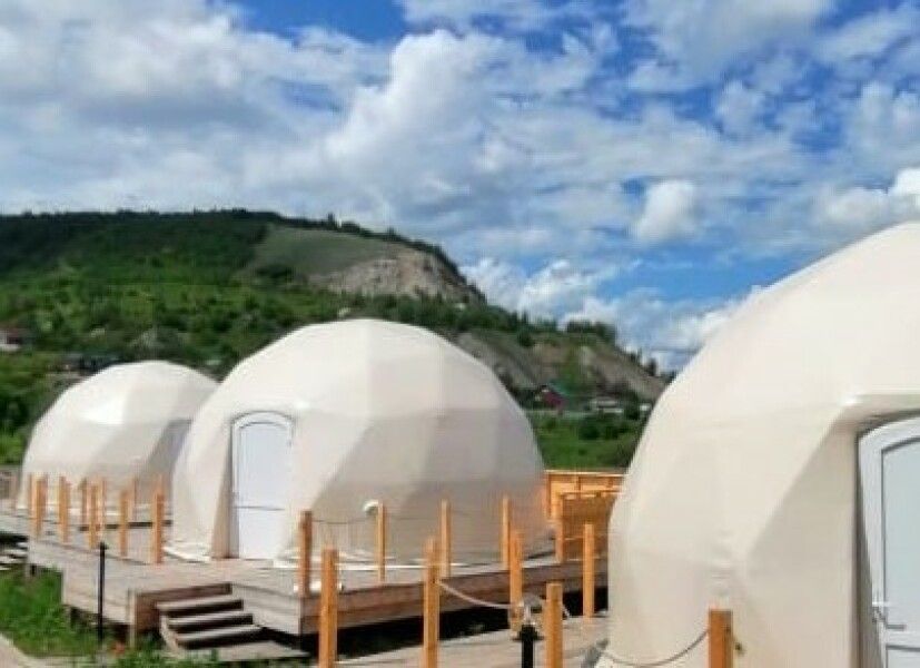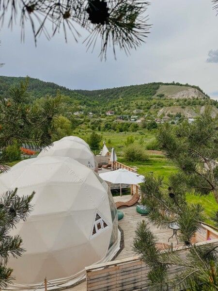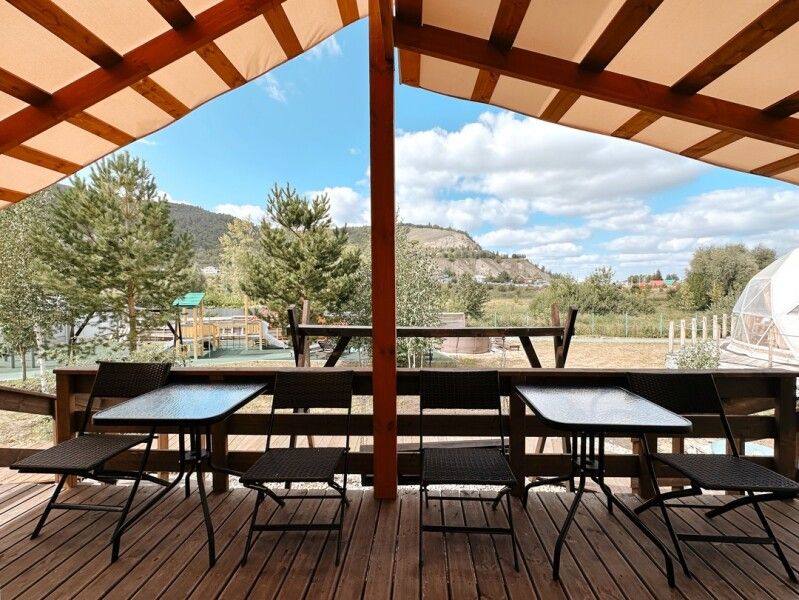 Площадь купола — 28 м², терраса — 20 м². Размещение: два взрослых + два ребенка. Вид на гору и сосны, панорамные окна, панорамная терраса. На территории оборудованы детские площадки с качелями.