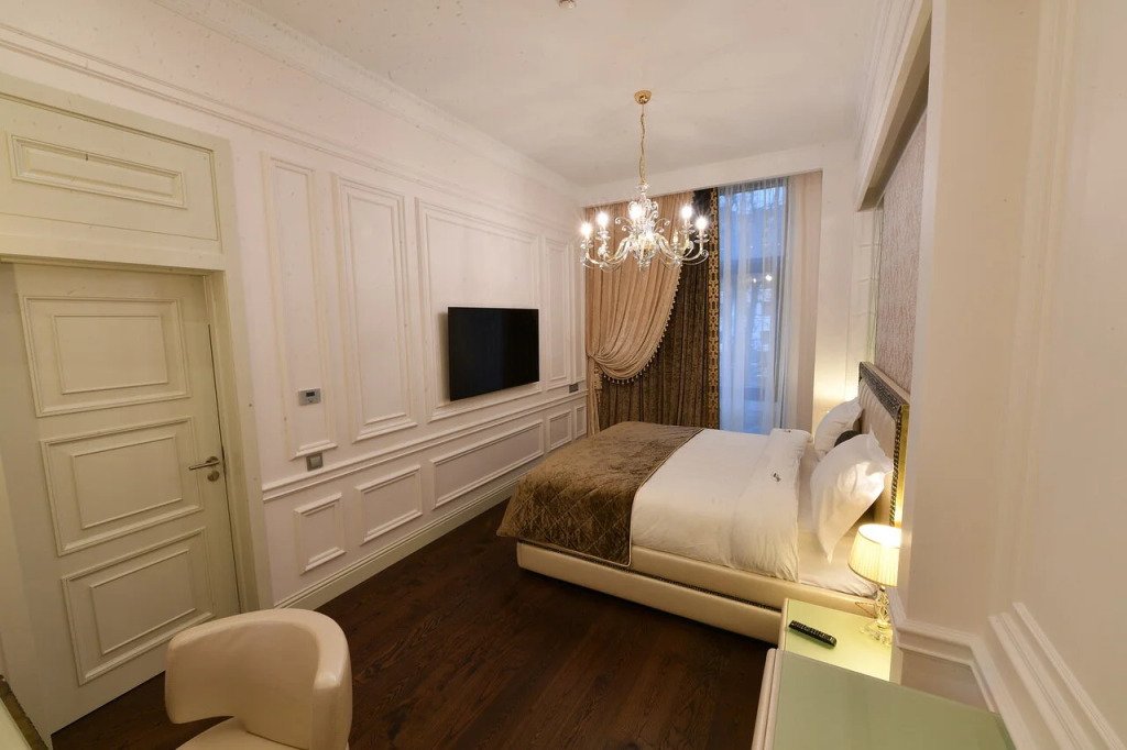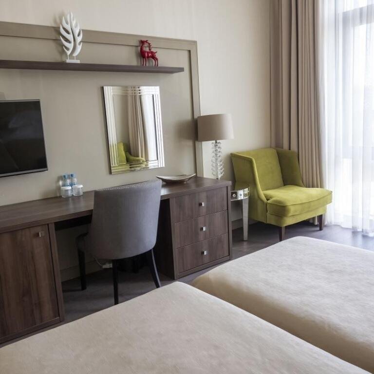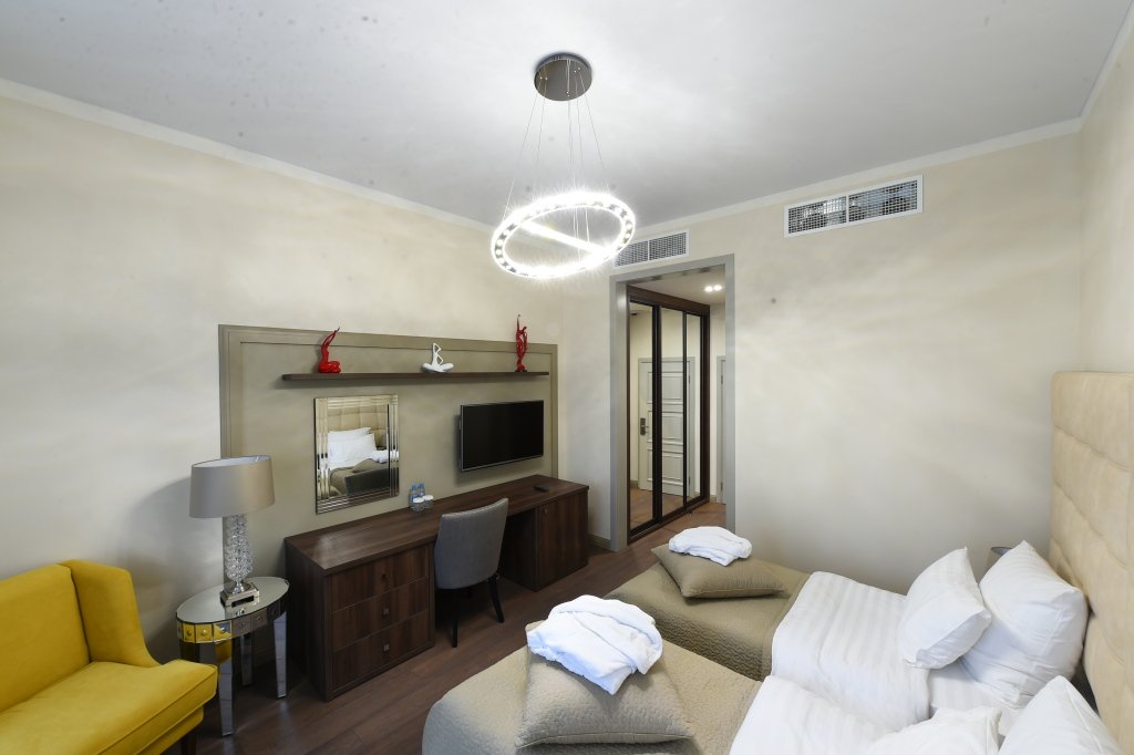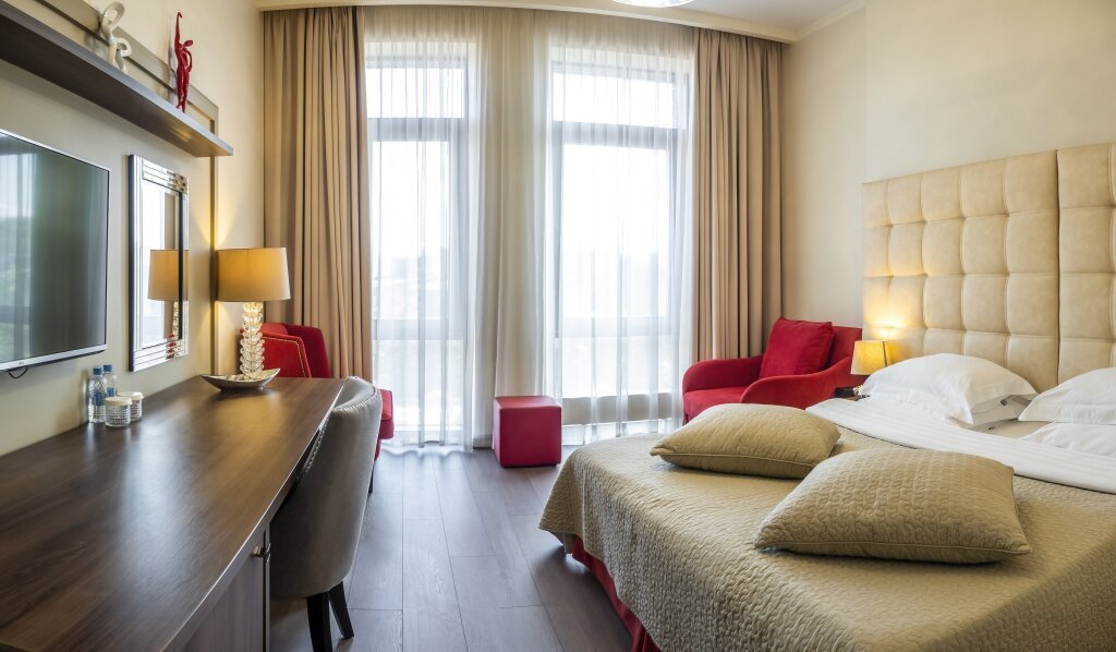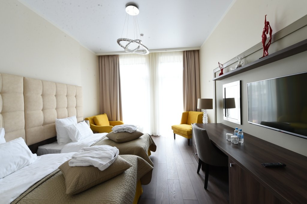 Чтобы вы могли отдохнуть после долгого дня, в номере есть телевизор, мини-бар и халат. Оснащение зависит от выбранной категории номера.