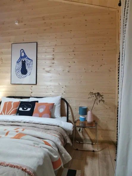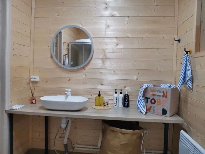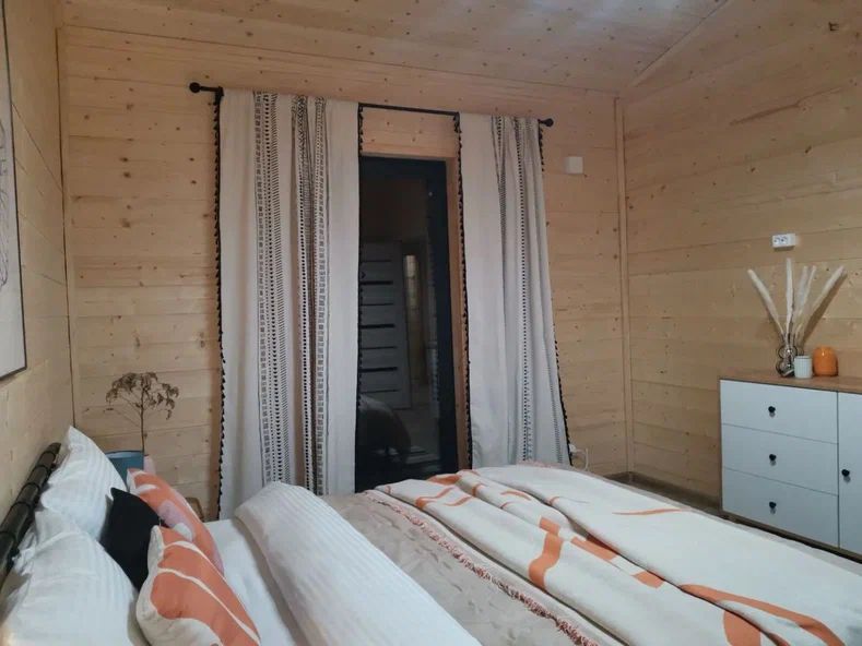 Внутри дома предусмотрены две односпальные кровати и одна двуспальная с ортопедическими матрасами для крепкого сна. В зале находится раскладной диван, подходящий для отдыха после активного дня. Кухня полностью оборудована всем необходимым для приготовления любимых блюд: варочной панелью, духовым шкафом и другой техникой. Посуда и столовые приборы на 6 персон предоставляются, а большой обеденный стол ждет для приятных бесед и угощений. На время отдыха доступен телевизор с онлайн кинотеатрами и настольные игры для всей семьи. Удобная душевая кабина в ванной комнате и необходимые средства личной гигиены обеспечивают комфорт.