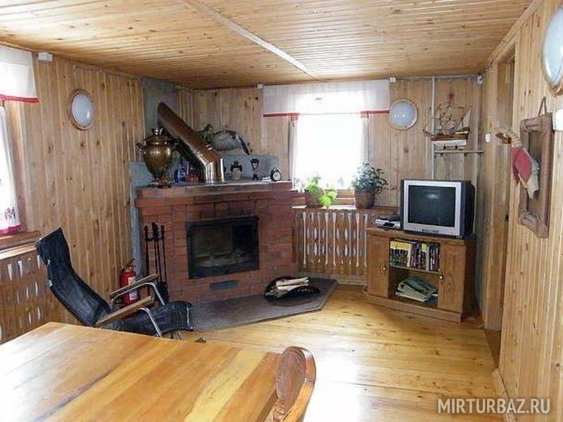 На первом этаже - кухня, гостиная с камином и диваном, санузел (туалет, горячий душ). Второй этаж - две спальни (кровати двуспальные).