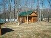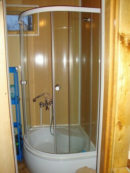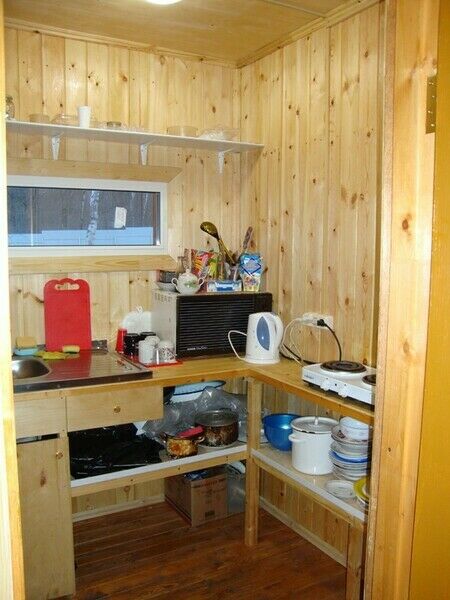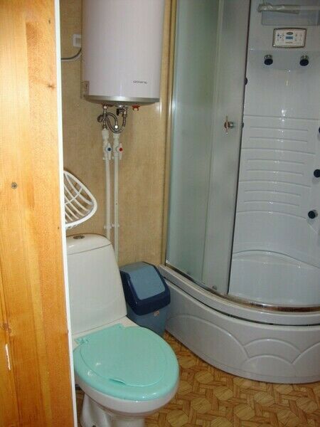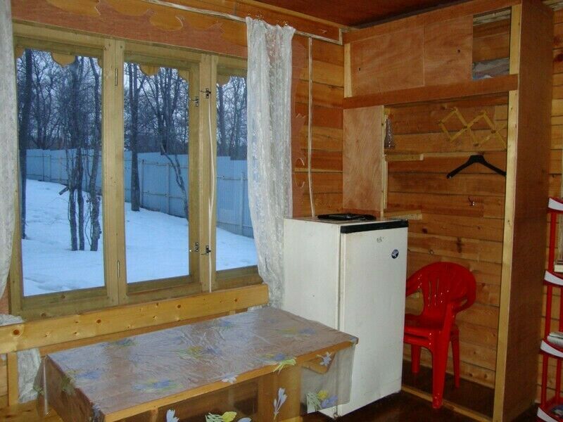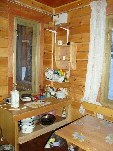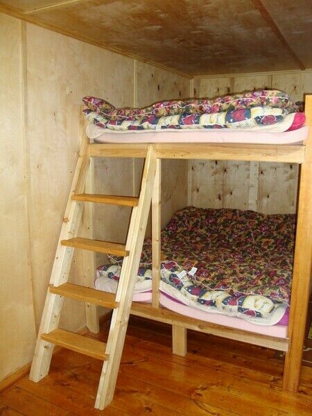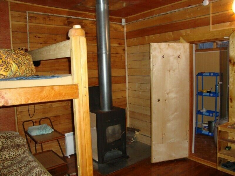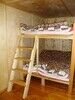 На кухне: кухонный угол с плитой, холодильником, микроволновой печью. В комнате - двуспальная двухъярусная кровать, камин, стол. Санузел с душем и туалетом.