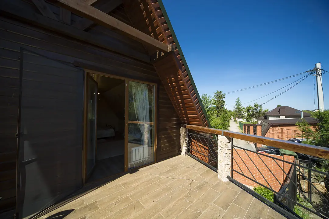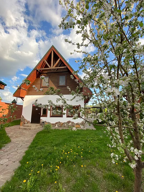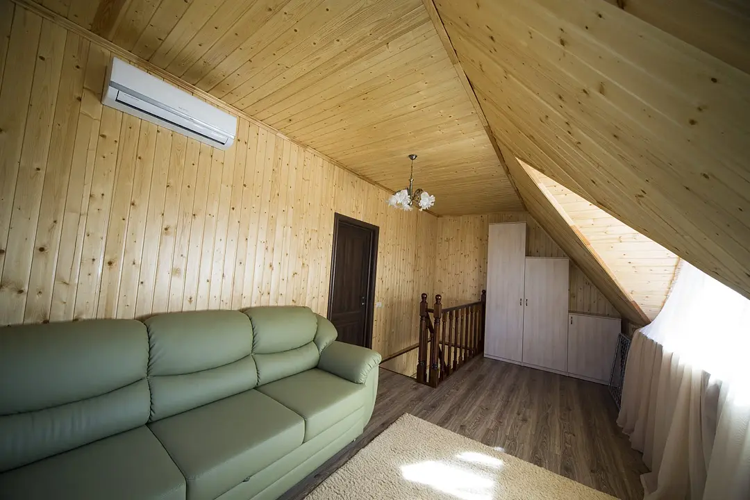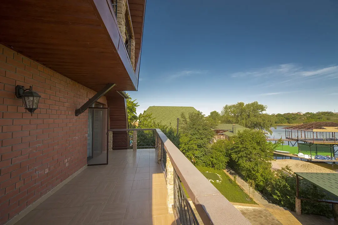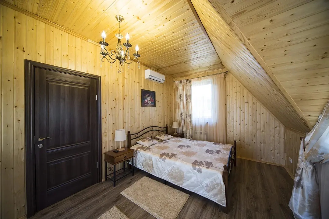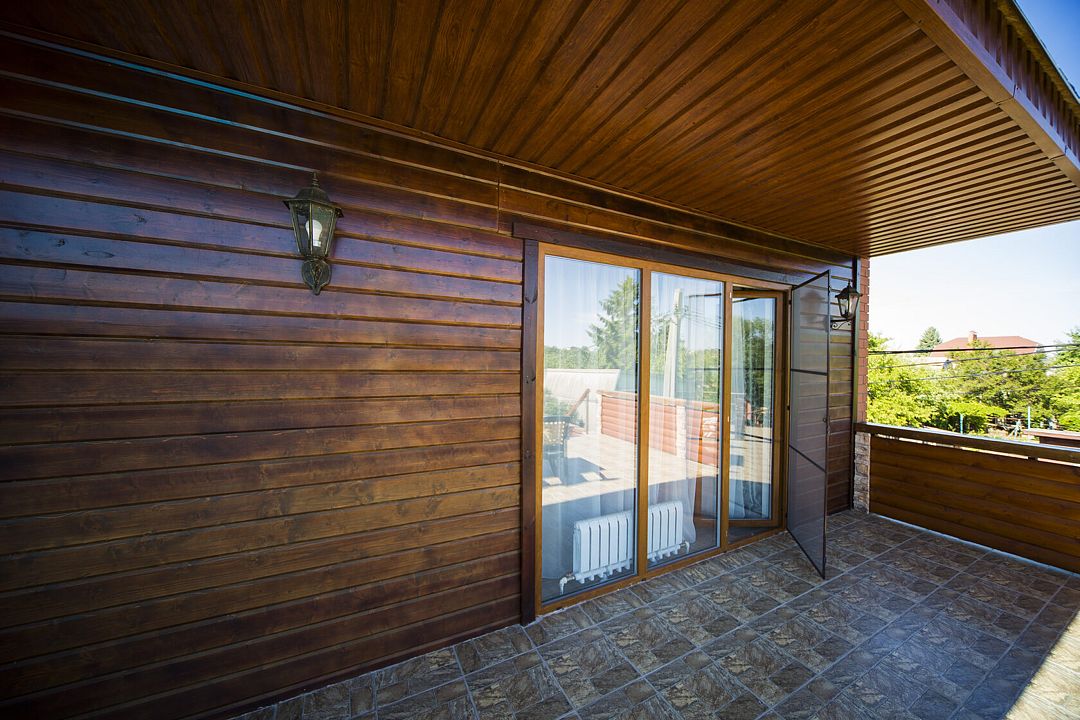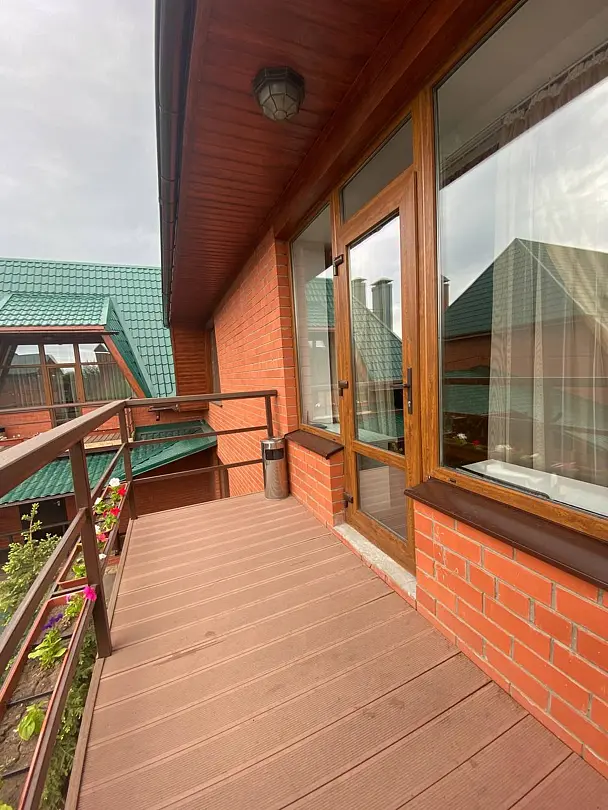 Обновлённый домик с сауной и кухней на первом этаже, двумя номерами на втором этаже, двумя балконами, один из которых с видом на реку.