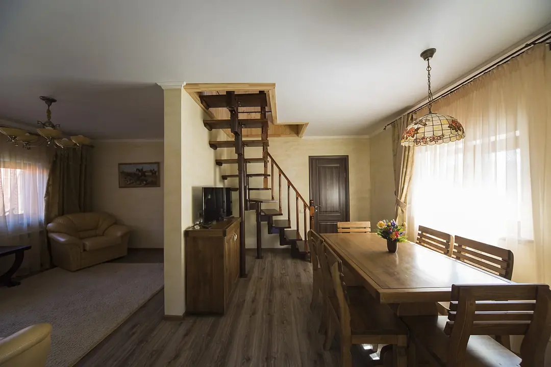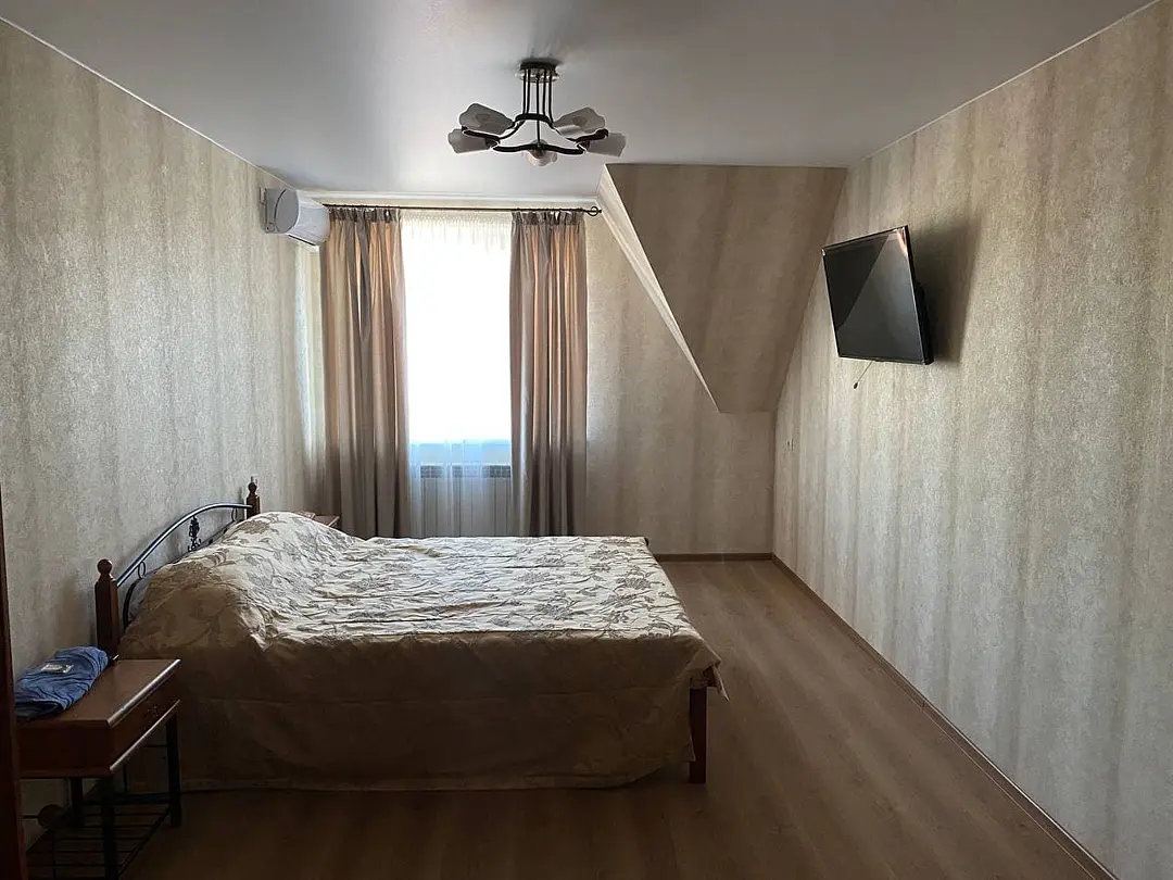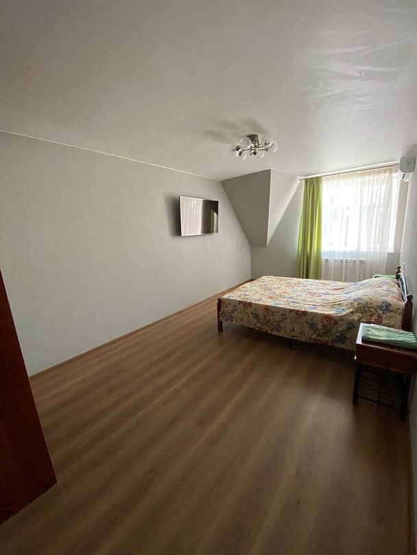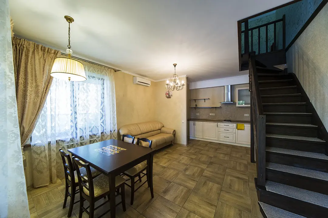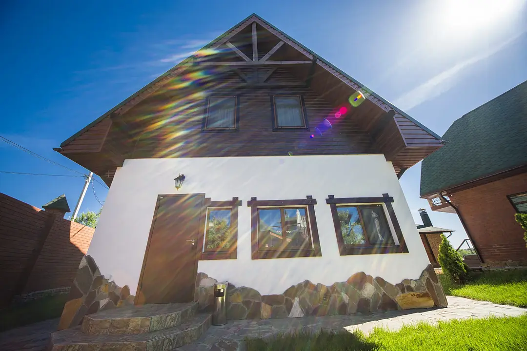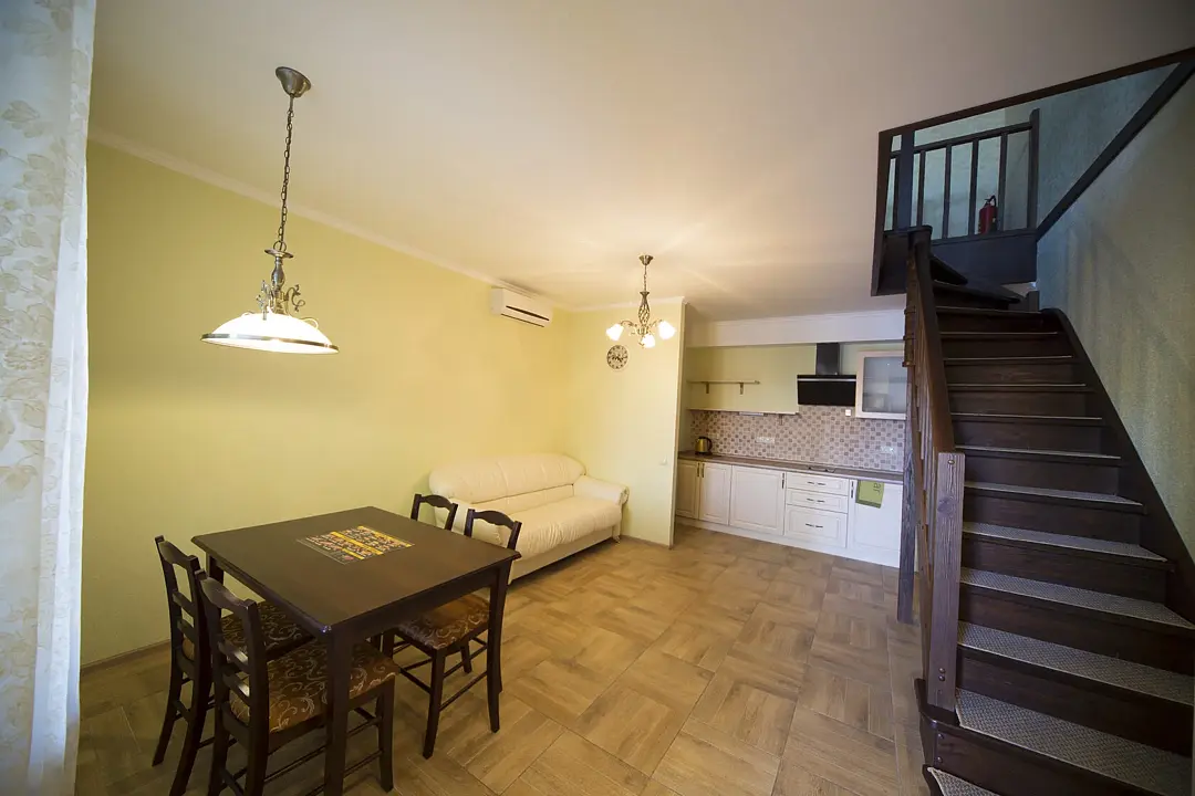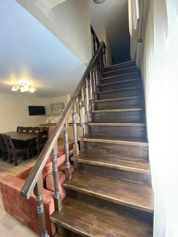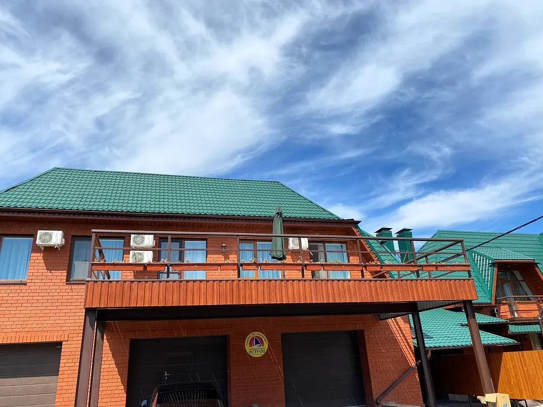 Обновлённый домик с сауной и кухней на первом этаже, двумя номерами на втором этаже, двумя балконами, один из которых с видом на реку.
