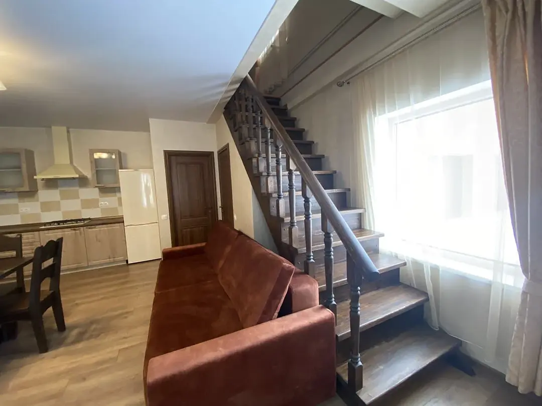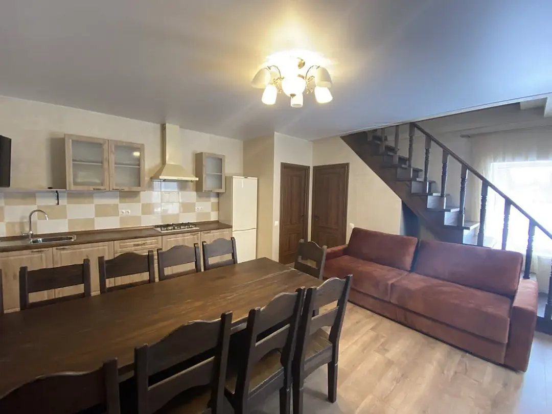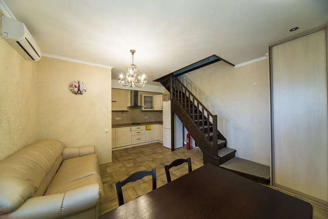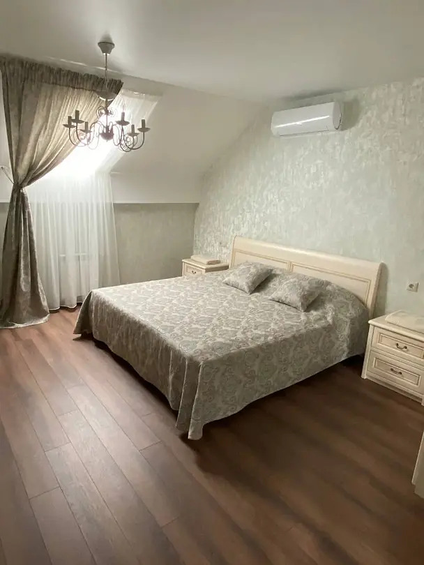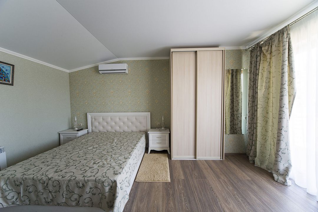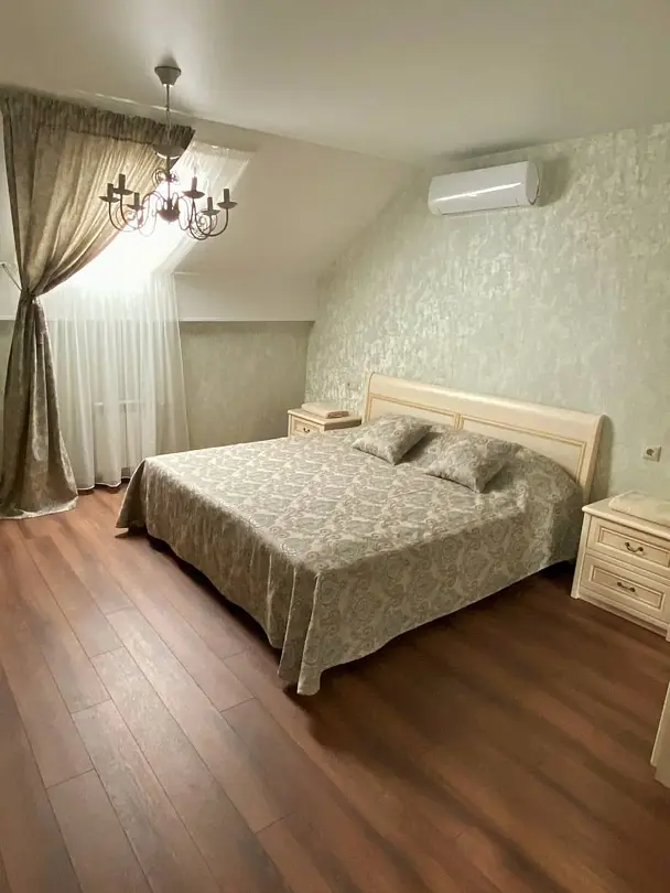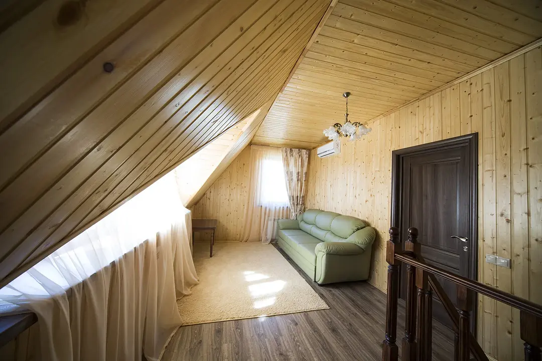 Обновлённый домик с сауной и кухней на первом этаже, двумя номерами на втором этаже, двумя балконами, один из которых с видом на реку.
