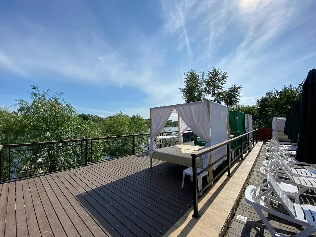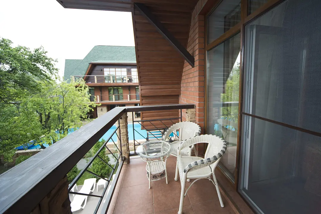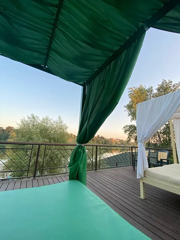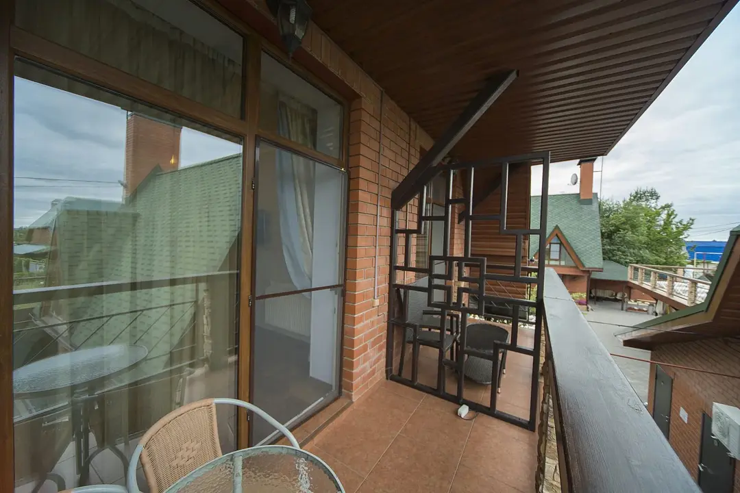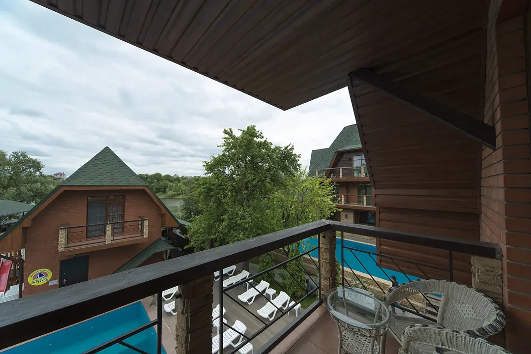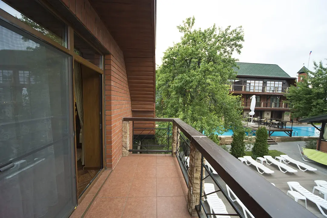 Ключевое отличие этого двухэтажного номера от других номеров (основного отеля) — это балкон-солярий с великолепным видом на реку. Один из самых любимых номеров гостей.