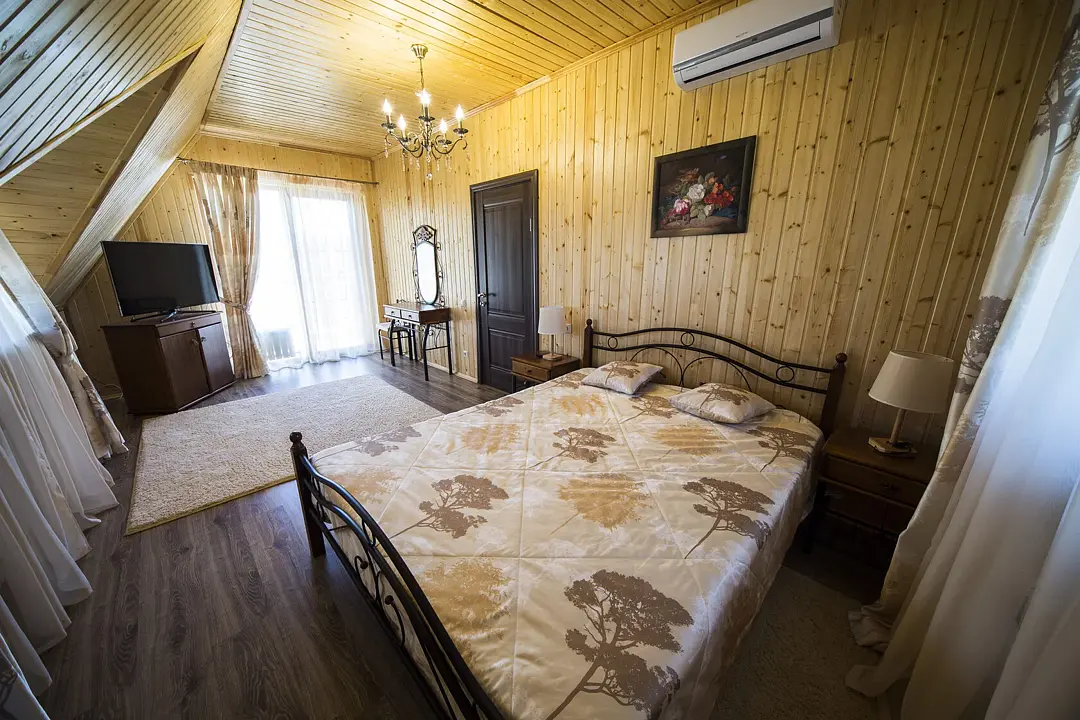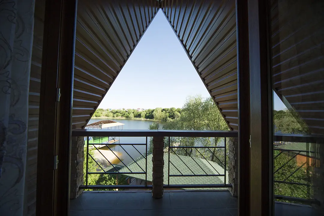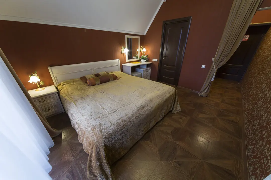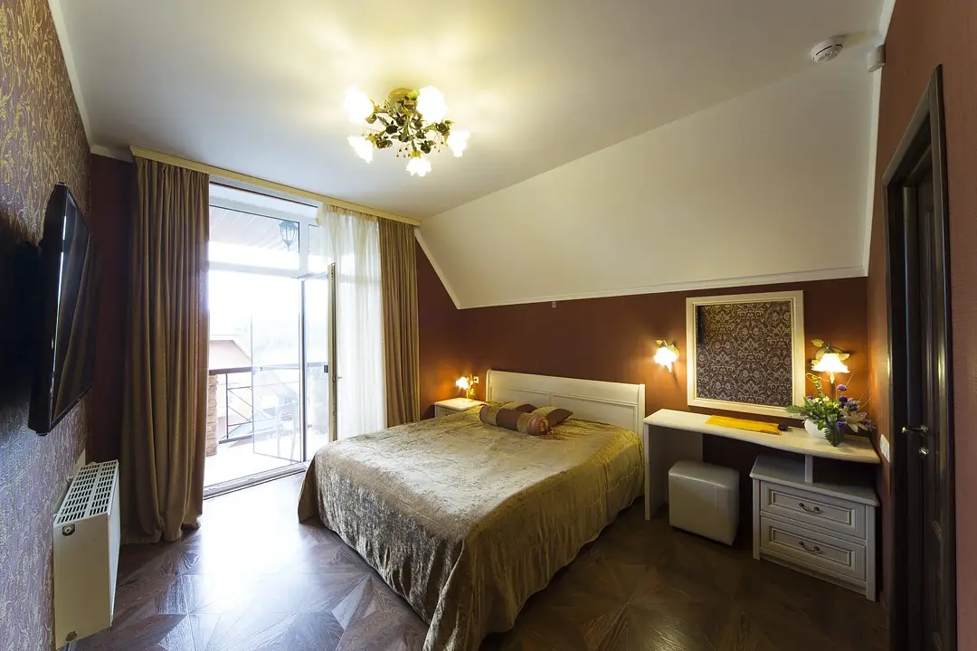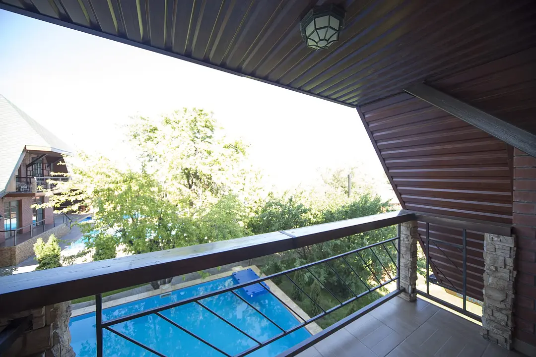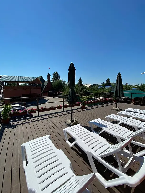 Ключевое отличие этого двухэтажного номера от других номеров (основного отеля) — это балкон-солярий с великолепным видом на реку. Один из самых любимых номеров гостей.