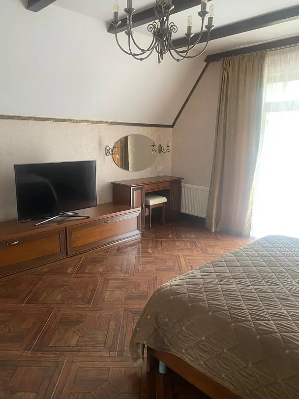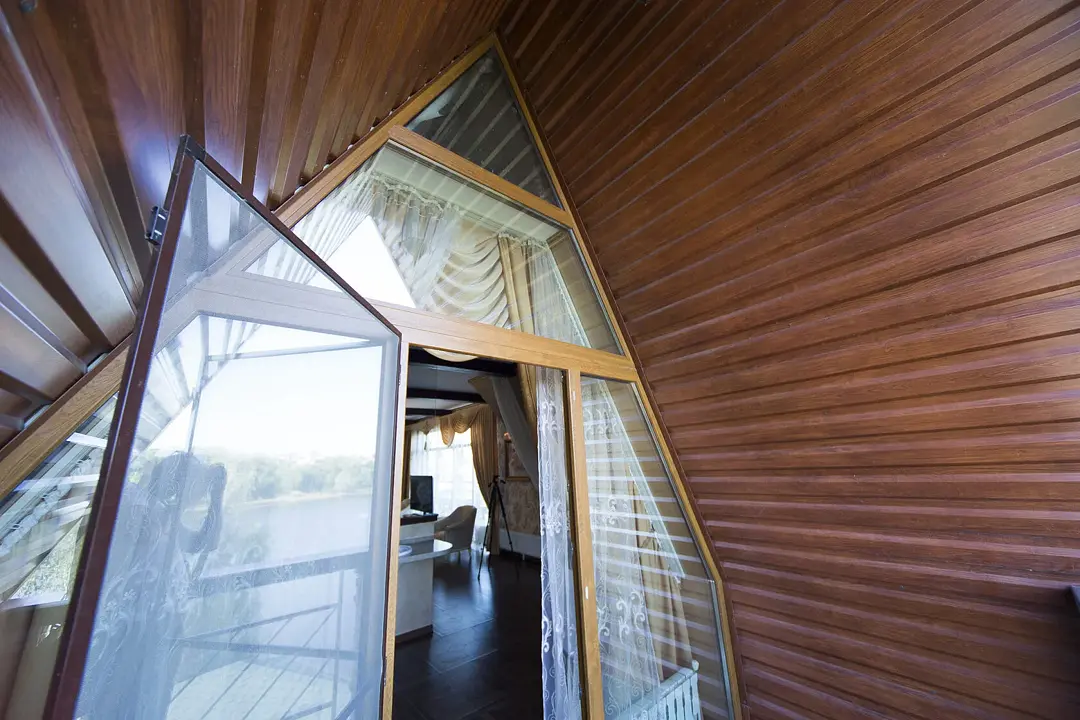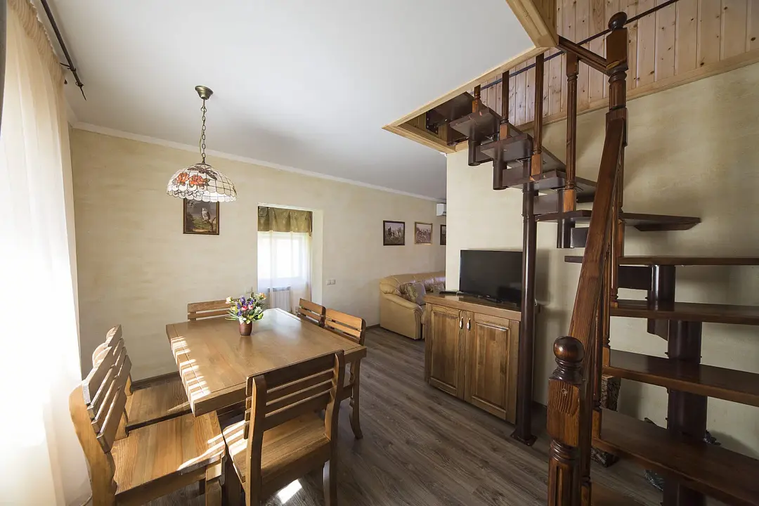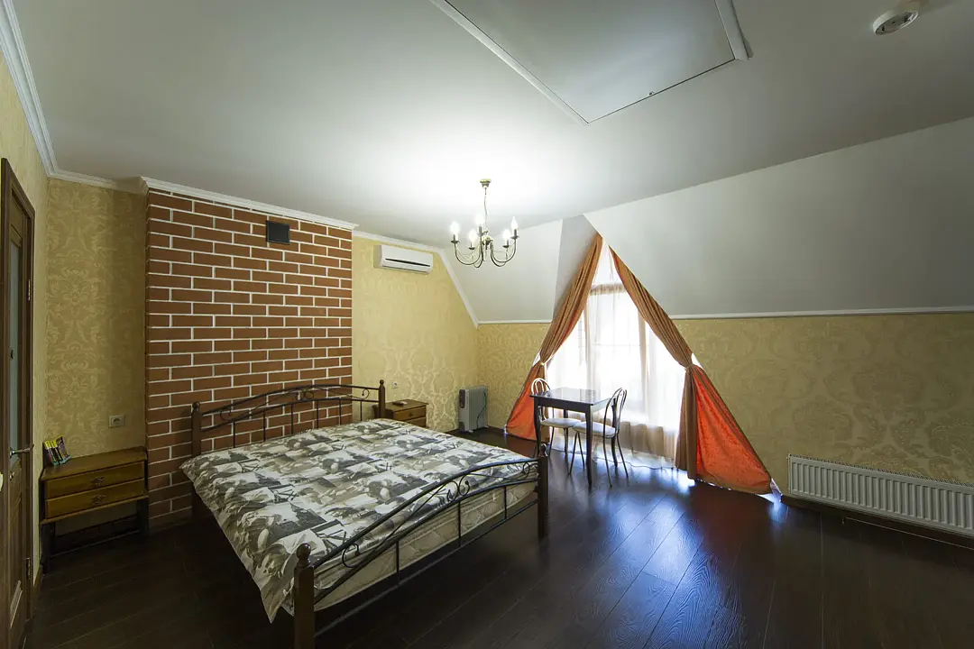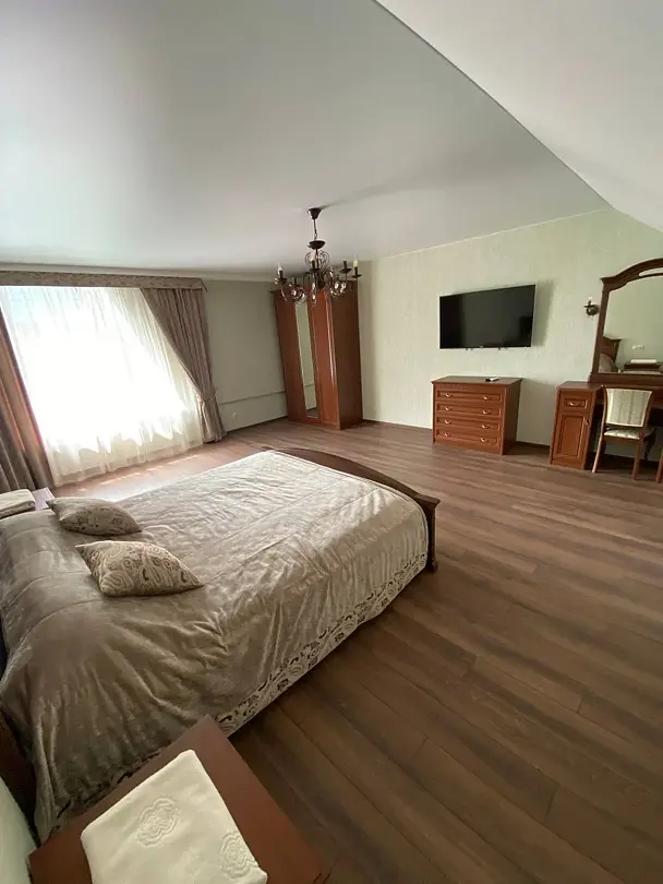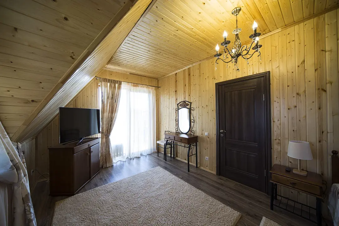 Ключевое отличие этого двухэтажного номера от других номеров (основного отеля) — это балкон-солярий с великолепным видом на реку. Один из самых любимых номеров гостей.