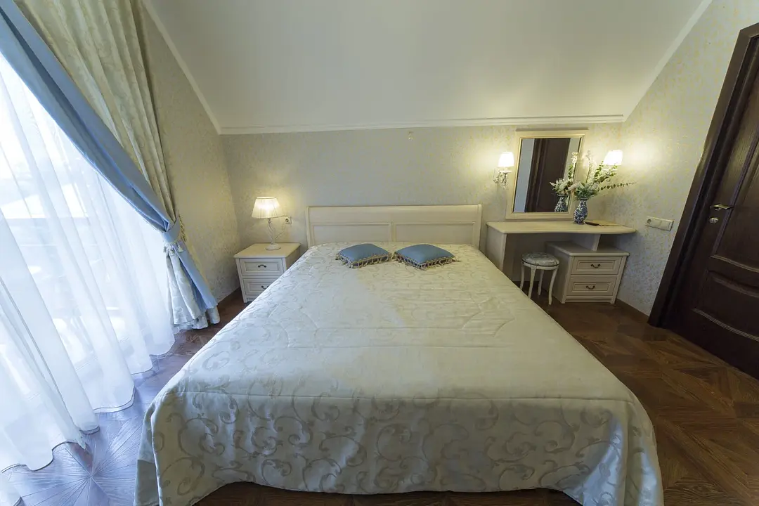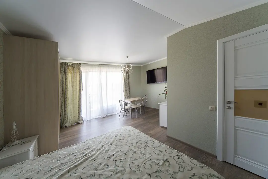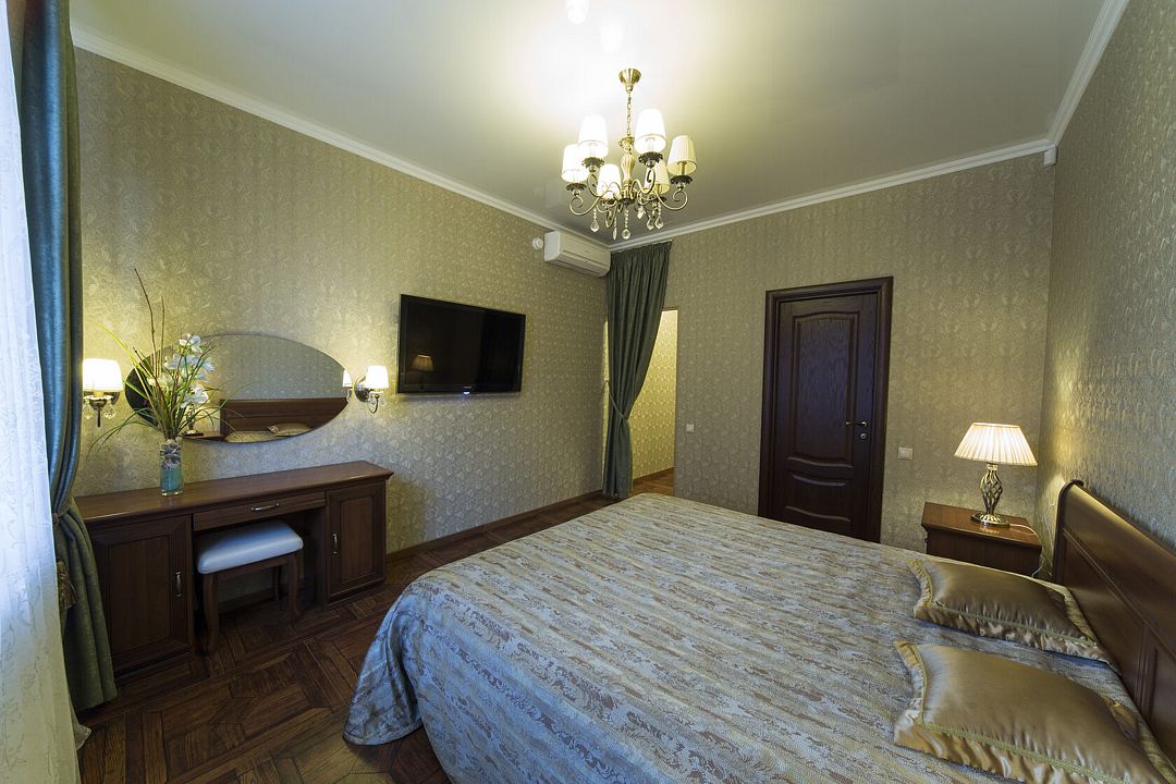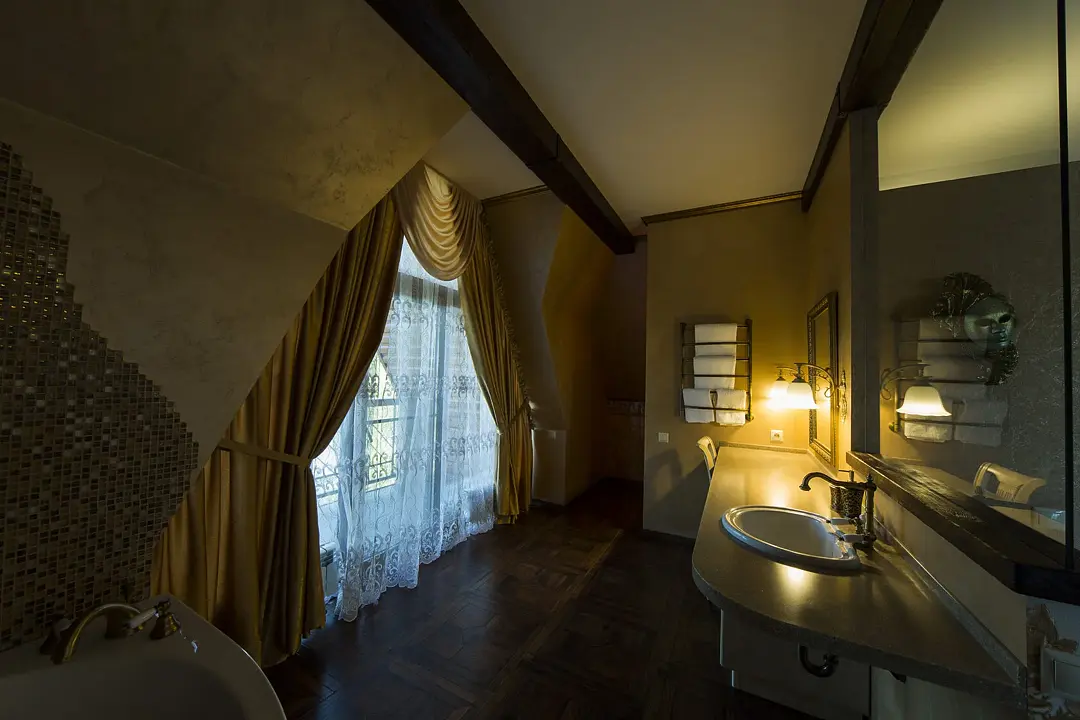 Для вашего комфортного проживания, в номере есть прихожая с зеркальным шкафом для верхней одежды, гардеробная со всем необходимым, спальня встретит вас шикарной двуспальной, поистине королевской кроватью с балдахином, а ванная — джакузи с видом на реку. Имеется обеденная зона с полностью оборудованной кухней.