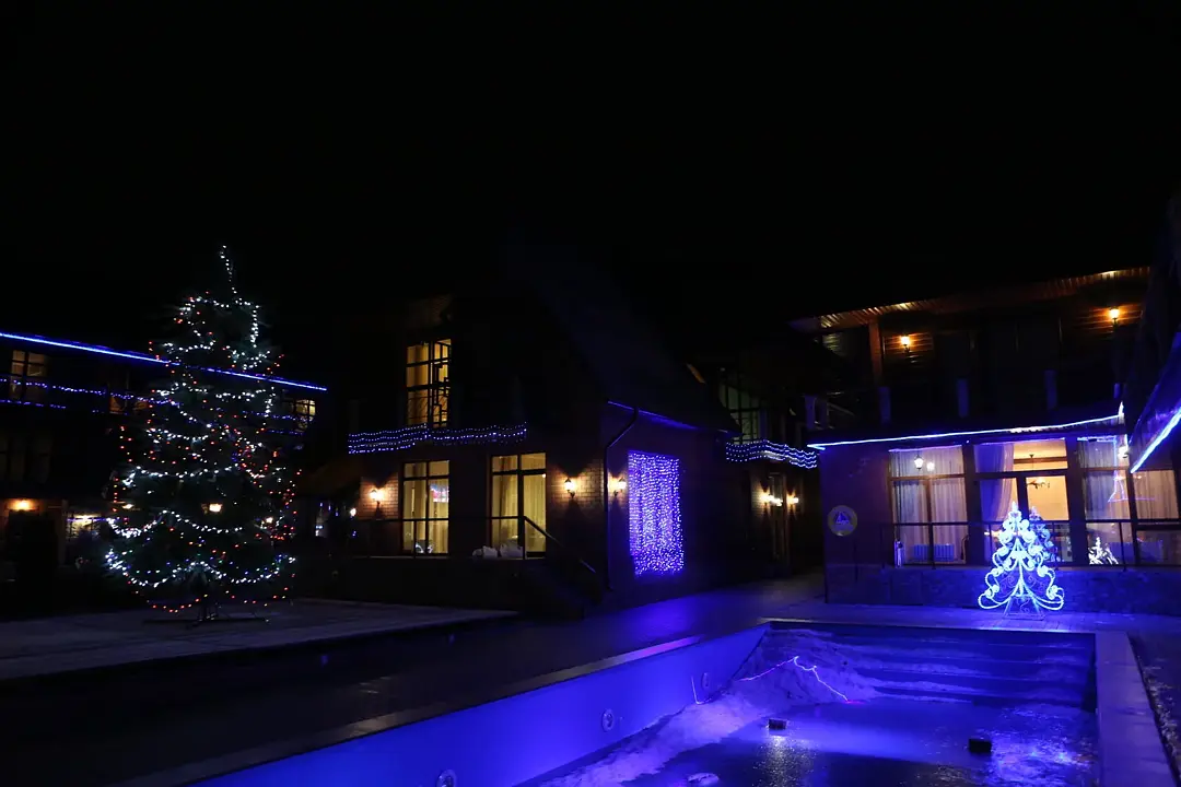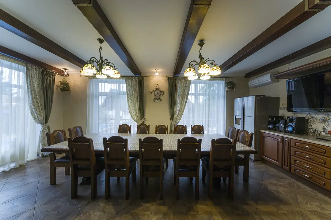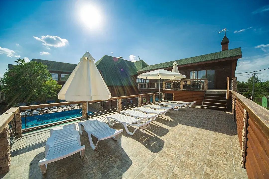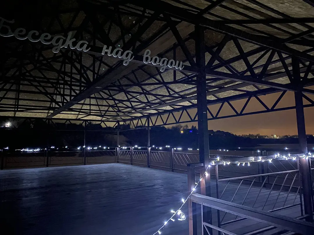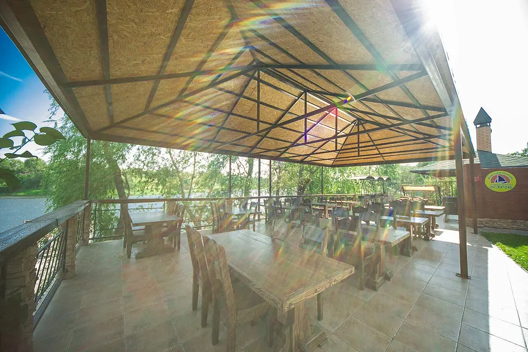 Беседка-банкетный зал. Большая, просторная беседка повышенной комфортности, площадью 50 кв. метров с панорамным видом на бассейн. Эта беседка оснащена собственной кухней, камином, мягким диваном, также в беседке есть HD-телевизор, аудиосистема, кондиционер, холодильник, душ, туалет.