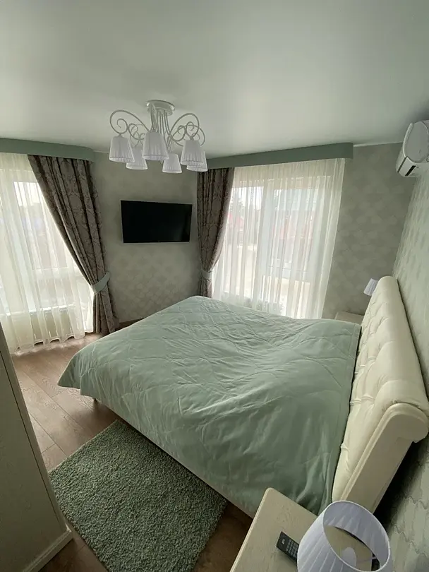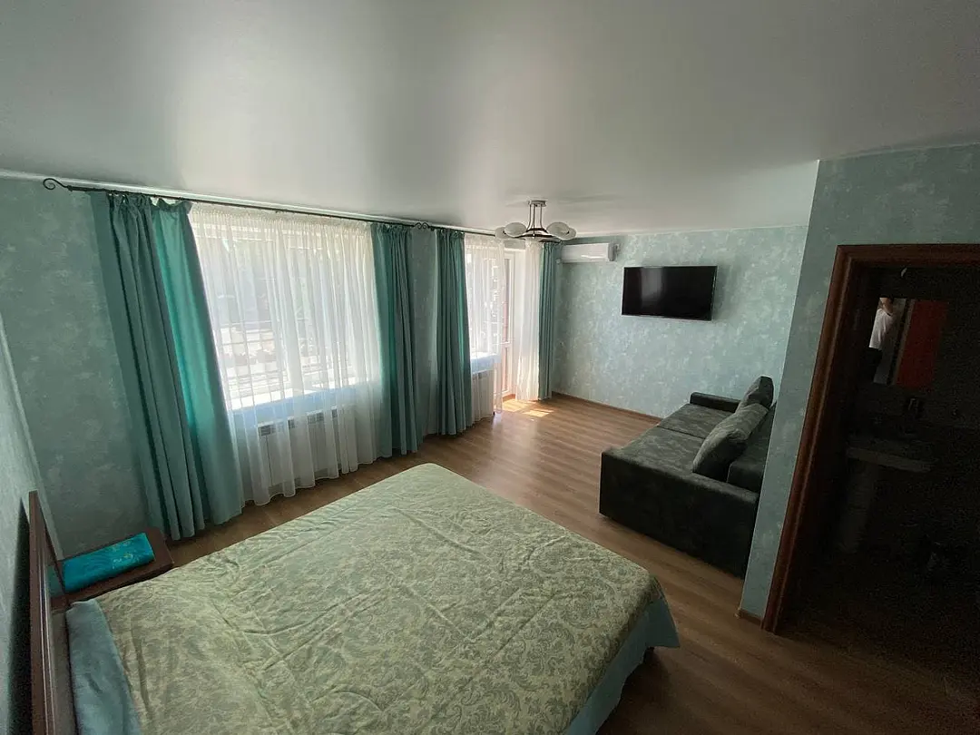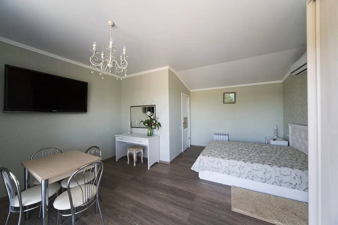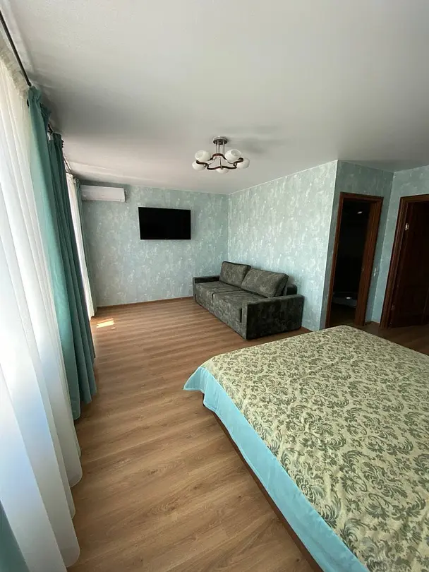 Новый номер состоит из одной двуспальной кровати и одним раскладным диваном. Также имеется выход на свою личную террасу с шезлонгами. Санузел в номере.