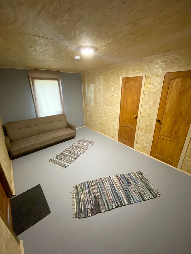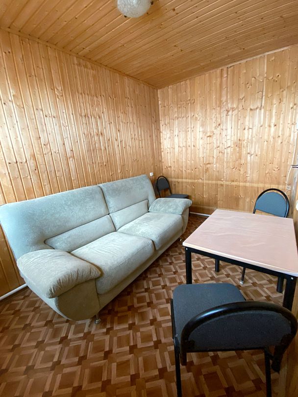 - 1 этаж: комната отдыха (двухспальный диван), кухонный гарнитур, баня и душевая