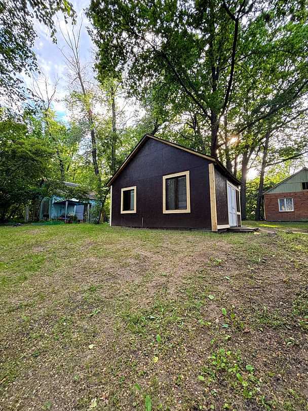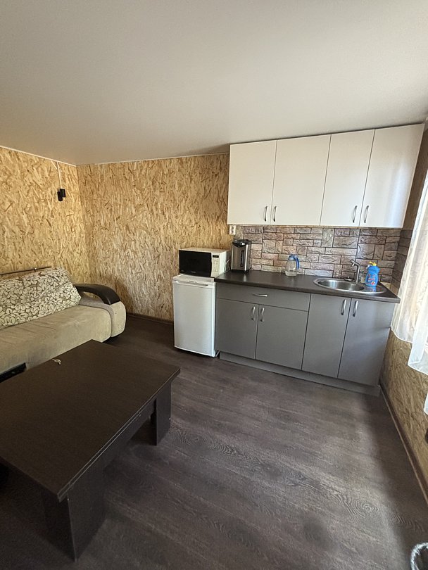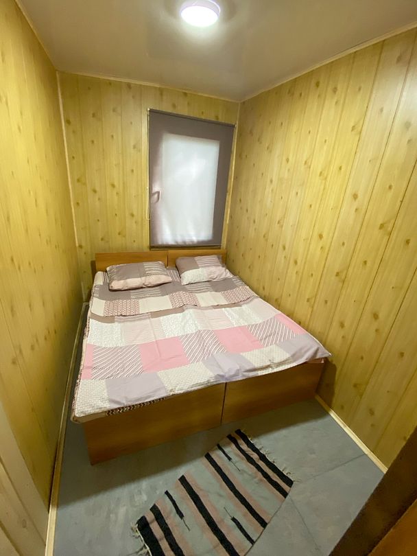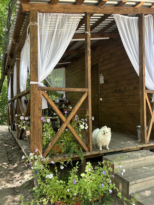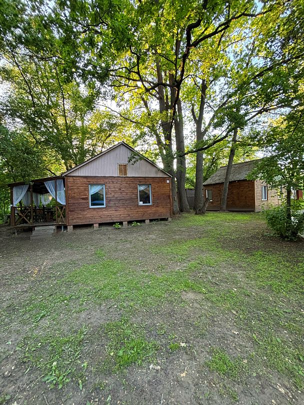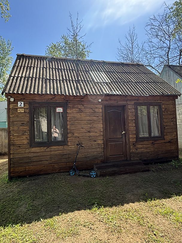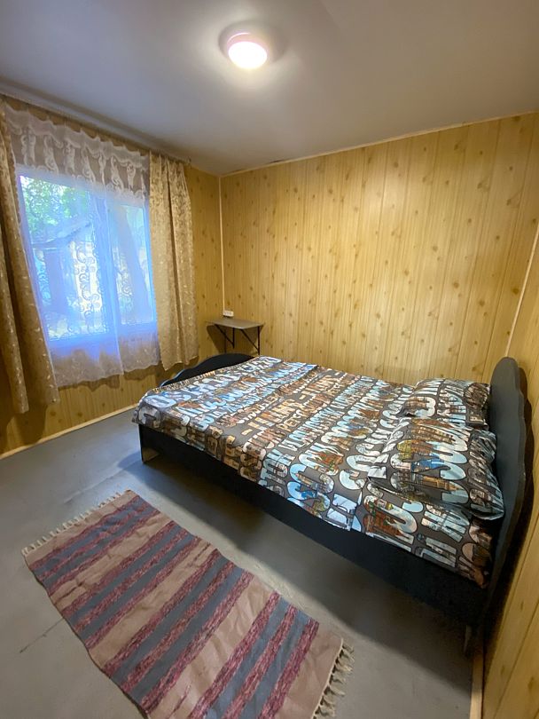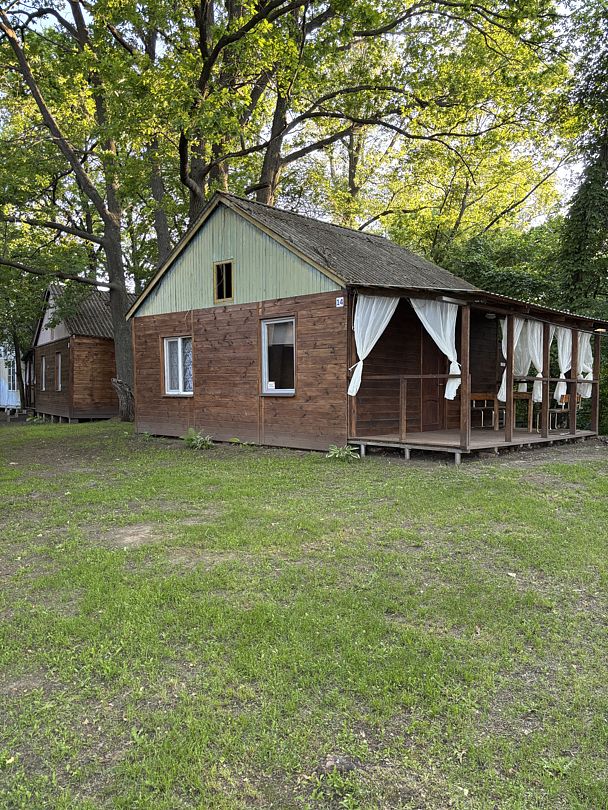 Отдельностоящий дом 2. Вместимость 4 человек. В доме имеется раковина, но удобства и душ находятся на территории турбазы. В доме 2 комнаты (в одной 2х спальная кровать, в другой двухместный диван). Также есть холодильник, микроволновка, термопот и сервировочная посуда. Для отдыха на природе возле домика стол и лавки.