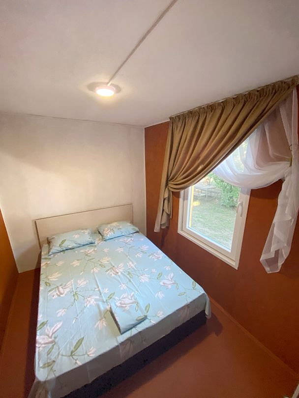 Отдельностоящий дом 12А. Вместимость 6 человек. В доме имеется веранда, а также удобства и душ. В доме 2 спальни (каждая с 2х спальной кроватью)и гостиная (с двухместным диваном). Также есть холодильник, микроволновка, термопот и сервировочная посуда.