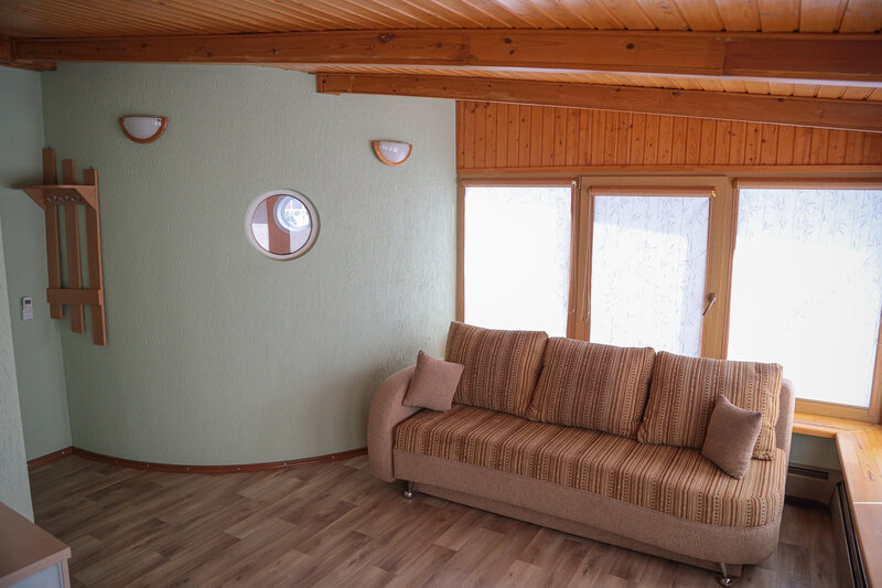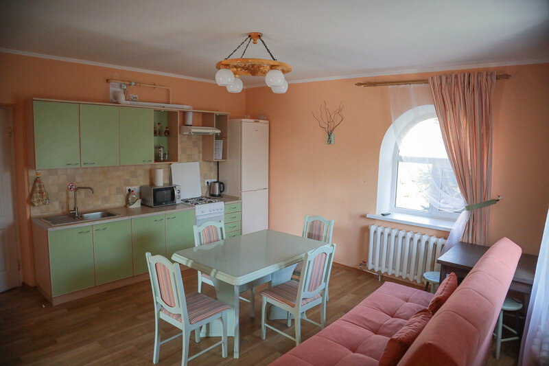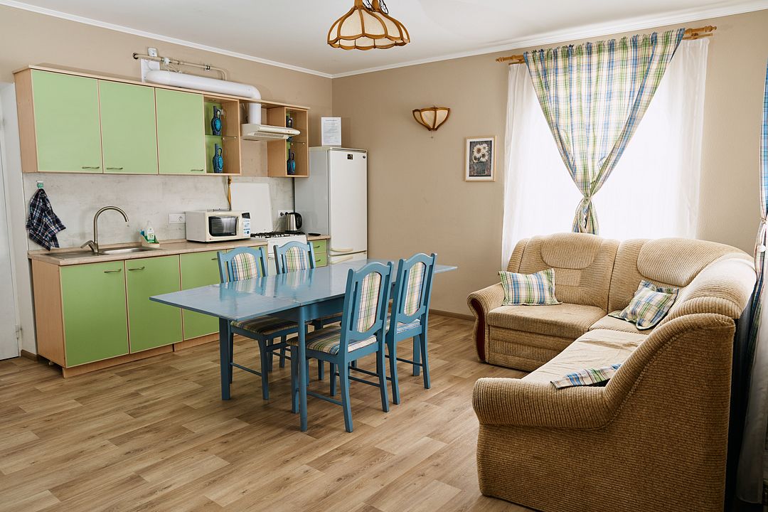 Кухня-гостиная (диван на 2-х человек), 4-х конфорочная газовая плита, холодильник, набор посуды, телевизор, 2 туалета/душа.