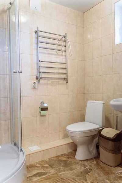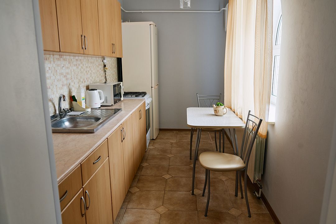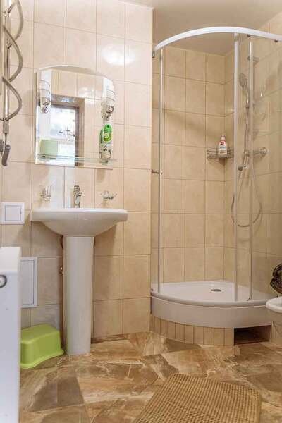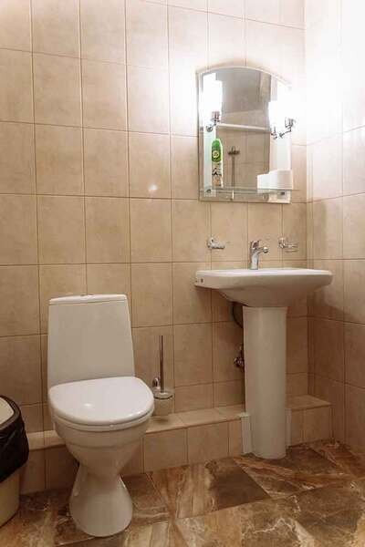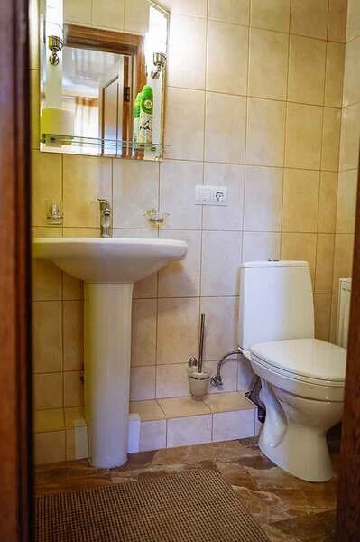 Кухня-гостиная (диван на 2-х человек), 4-х конфорочная газовая плита, холодильник, набор посуды, телевизор, 2 туалета /душа.