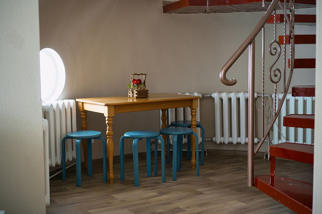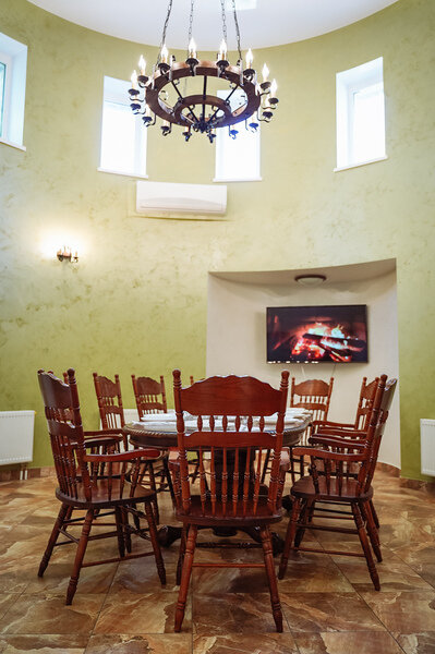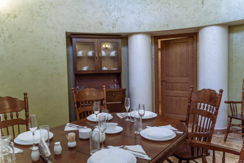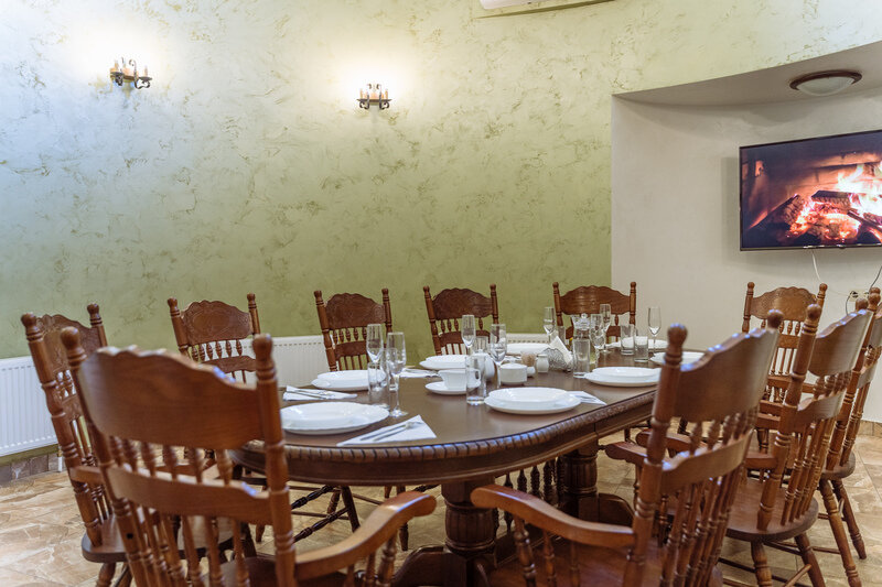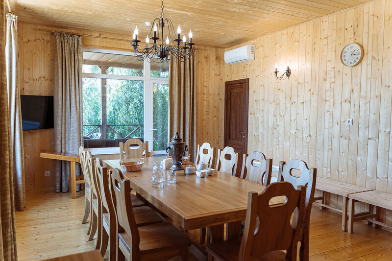 Обеденный зал на территории 5 корпуса с красивой деревянной мебелью, ТВ-панелью (55*диагональ), рядом есть оборудованная кухня (полный комплект посуды, СВЧ, электрическая плита, холодильник). Вместимость до 10 человек.