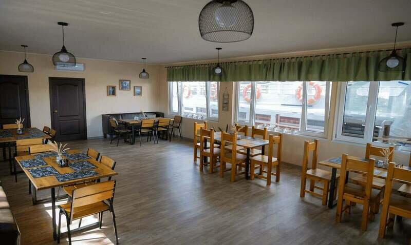 Закрытый кондиционированный зал на дебаркадере с большой зоной остекления и видом на Волгу, просторная веранда, удобная кухонная зона (полный комплект посуды, СВЧ и большой холодильник), ТВ-панель (55*диагональ). Вместимость до 35 человек.
