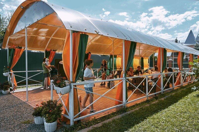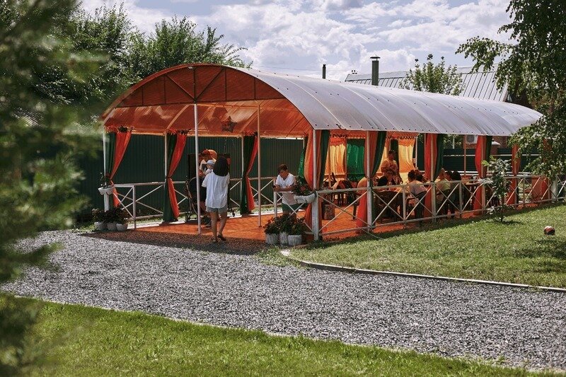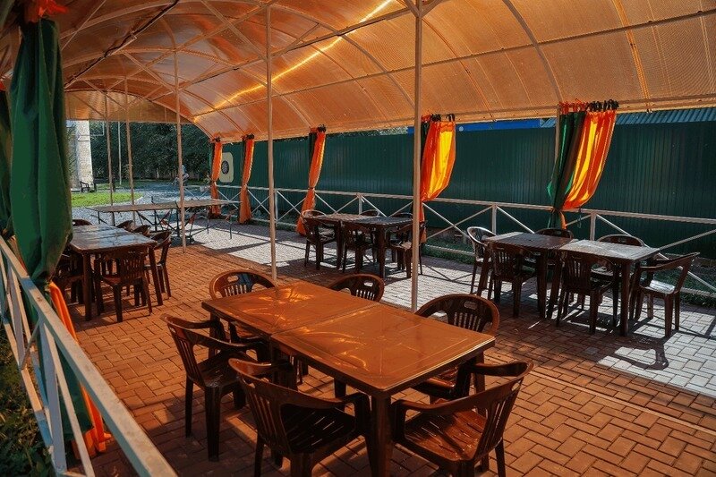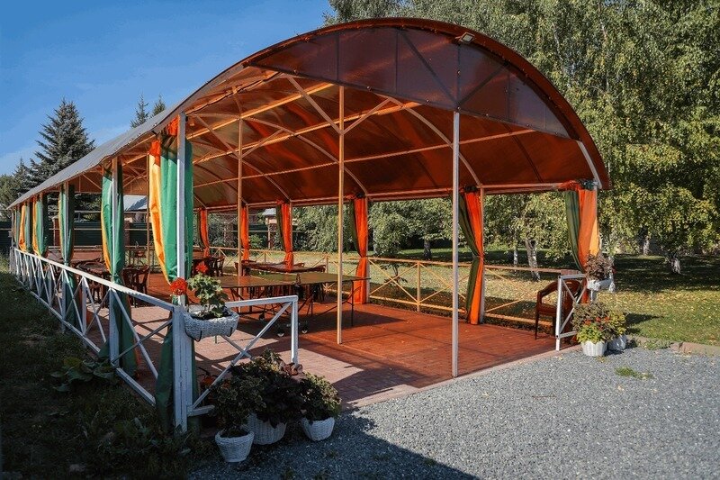 Просторная открытая беседка, оборудованная электричеством, зоной для мытья и разделки, пластиковой мебелью и мангальной зоной. Вместимость до 40 человек.