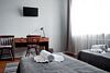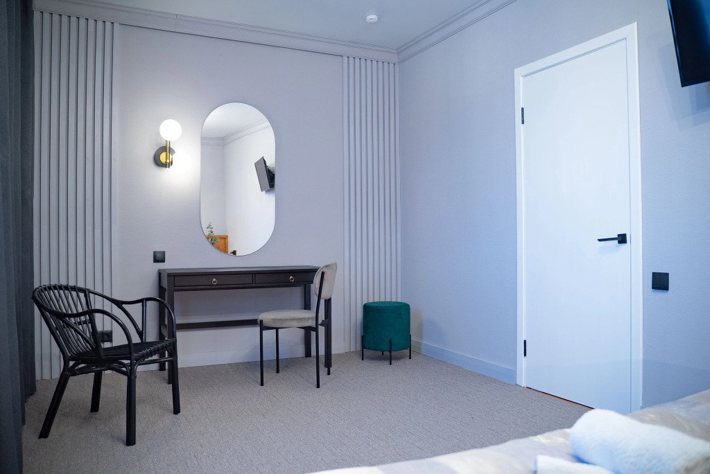 В каждом номере есть кровать, прикроватная тумбочка, светильник, кондиционер, смарт-ТВ с подпиской на стриминговый сервис холодильник, чайник, фен, раковина, душевая кабина и унитаз. Гостям предоставляются отельные тапочки, шампунь, гель, шапочки и бутилированная вода.